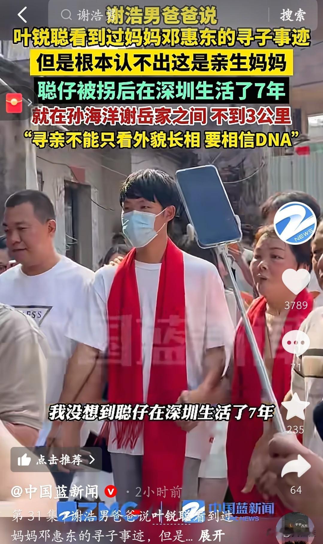 谁能想到?叶锐聪被拐后在深圳住了7年,离孙海洋、谢岳家不到3公里——亲妈邓惠东的寻子信息他看过,可愣是认不出这是亲妈。 谢浩男爸爸说,这孩子早忘了小时候的样子,只觉得“寻子新闻里的人”和自己没关系。直到DNA比对上,一家人抱着哭成一团。 想想多揪心啊:妈妈满世界找娃,娃就在眼皮子底下长大;孩子刷到寻亲信息,却没把“陌生人”和妈妈画上等号。 所以说寻亲别光看长相,DNA才是硬凭证。也盼着更多被拐的孩子,能像他这样,靠着科技和坚持,扎进亲妈怀里。