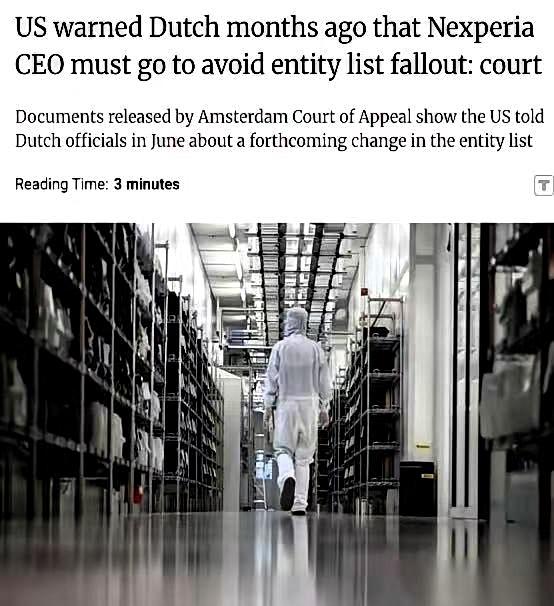 美国人直接跟荷兰摊牌了。 原话大概是这么个意思:“把你们那家中资芯片公司的中国CEO换掉,不然,我就把你整个公司拉黑。” 一点弯都不绕,这事就砸在了安世半导体头上,他们在荷兰的公司资产说冻结就冻结了,荷兰那边说的是供应链安全,可法院的文件写得明明白白,美国六月份就开始施压,就是要把那个中国CEO给弄下去。 荷兰政府还一直说这是他们自己的决定,法院记录可不是这么说的,六月就跟美国国务院坐一块儿开会,聊的重点就是怎么让中国人下来,荷兰的经济大臣还特地写信去解释,现在文件往那一放,谁都看得懂是怎么回事。 安世半导体也不是第一次遇到这种事,母公司闻泰科技收购它之后,去年就被美国拉进了实体清单,现在这手又伸到欧洲来了,彭博社的说法,美国这套长臂管辖,翻来覆去就这么用。 闻泰科技那边发了个声明,说这就是打着合规的幌子,实际上就是为了权力,中国欧盟商会也出来说话,认为这种行为跟现代经济里的强取豪夺没什么两样。 我们商务部这边反应也快,安世半导体在国内生产的一些部件,直接就出口管制了,欧洲的车企一下就坐不住了,安世可是全球第三的功率半导体厂商,欧洲好多汽车生产线都指着他们的芯片呢,十六家车企一块出来喊话,说芯片要是断了,工厂可能就得停工。 荷兰那个看守政府,马上就要下台了,偏偏在这个时候给美国送份大礼,这礼送出去了,后面的烂摊子全留给欧洲的汽车行业来收拾,整个产业链本来是连在一起的,非要给它掰断,到头来受影响的不是哪一家公司,而是链条上的每一个工人,每一个家庭。