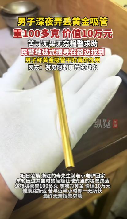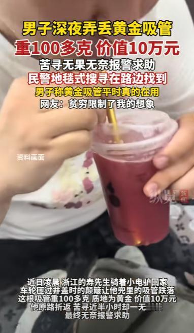 有钱任性!浙江一小伙报警,称自己丢失了一根吸管,让民警帮忙找找,民警一听还以为是捣乱的,结果,小伙却说,这根吸管不一般,是他用黄金打造的,专门用来喝奶茶,当得知这吸管有100多克时,民警都傻眼了! 浙江有个小伙子,前阵子遇上件挺离谱的事,他报警,说自己丢了一根吸管,刚开始的时候警察以为是恶作剧,不料等他说到是纯金的吸管的时候,一下子就傻眼了。 事情的起因是小张(化名)平时就特别爱喝奶茶和各种饮料,慢慢地,他觉得普通吸管太普通,喝起来总少了点“仪式感”,于是,他干脆自己定做了一根一百多克的纯金吸管。 这根吸管做工精细,光泽闪亮,每次在喝奶茶的时候,他小心翼翼地把吸管插进杯子里,几乎是用一种仪式感的动作,生怕磕到杯口或者碰掉手里的金属。 即便是在外面,他也会把吸管装在专门的小盒子里,随身携带,每次喝的时候拿出来,用完再收好,保持它完好无损。 然而就在近几天晚上,他骑电瓶车回家的时候路过一个大坑,车轮一颠,吸管掉了出去,他自己还没察觉,到家发现吸管不见了之后很着急,立马就回来的路上找了起来。 夜里灯光昏暗,他拿着手机沿路照地,一边走一边找,折腾了半个多小时还是没找到,最后只能报警,警察听了之后以为是在闹着玩,但等了解到是黄金做的时候立马就认真了起来。 警察赶到了之后就立马分析这根吸管可能落的位置,分析完之后大家开始往前找,不到一百米就真的在路边找到了。 看到习惯变得坑坑洼洼了之后,小张感觉到很惋惜,后来又说到一会去会给融了,等到下年夏天的时候再重新打造一个新的。 吸管找回来之后这事传上网后热度比吸管还滚得快,有人说他太炫富,骑电动车还用十万块的吸管,也有人调侃:“这根吸管的钱够喝奶茶喝一辈子了。” 其实,这件事看似离谱,却让人反思一个问题,有钱人该不该“低调”?但说到底,花自己的钱买自己喜欢的东西,并没有错,只不过,贵的东西,再喜欢也要保管好,别再丢了。 对此,你还有什么看法呢? (信息来源 :纵览新闻 )