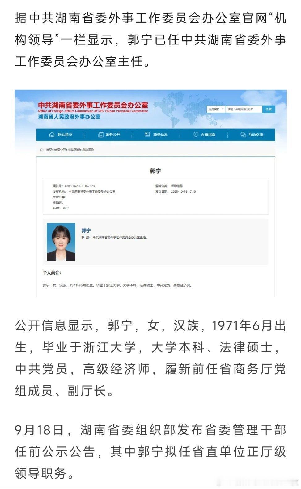 郭宁已任湖南省委外事工作委员会办公室主任。热点现场