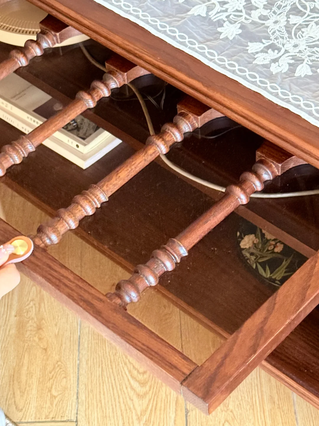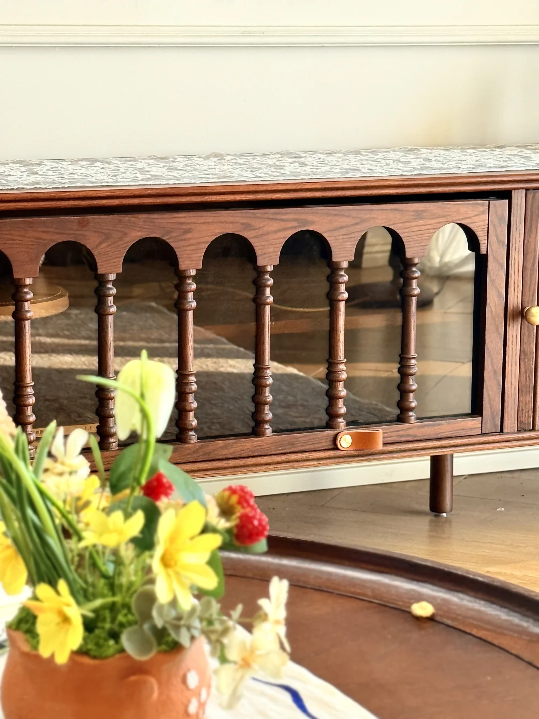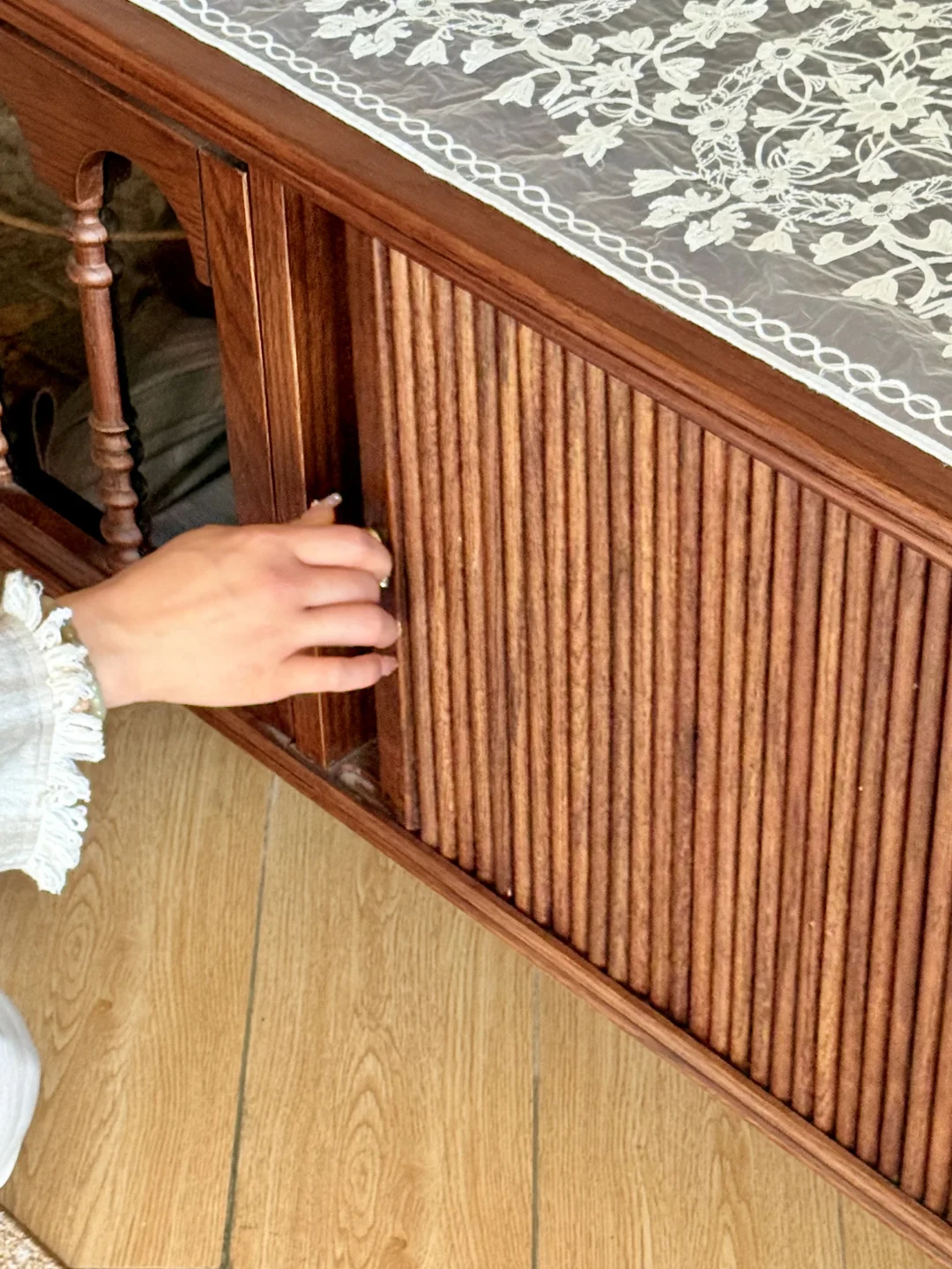 细节真的很打动我。拱门造型有点英式庄园的优雅,嵌了茶色玻璃之后,显得通透不沉闷。上翻柜门里面那排立体串珠是手工打磨的,卷帘门也是38根木条一根根手工拼的,每次开合都特别顺滑,从来没卡过。
