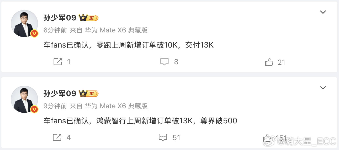 现在的周订单榜Top 3里,鸿蒙和零跑已经稳坐前二, 那第三会是谁?[思考]