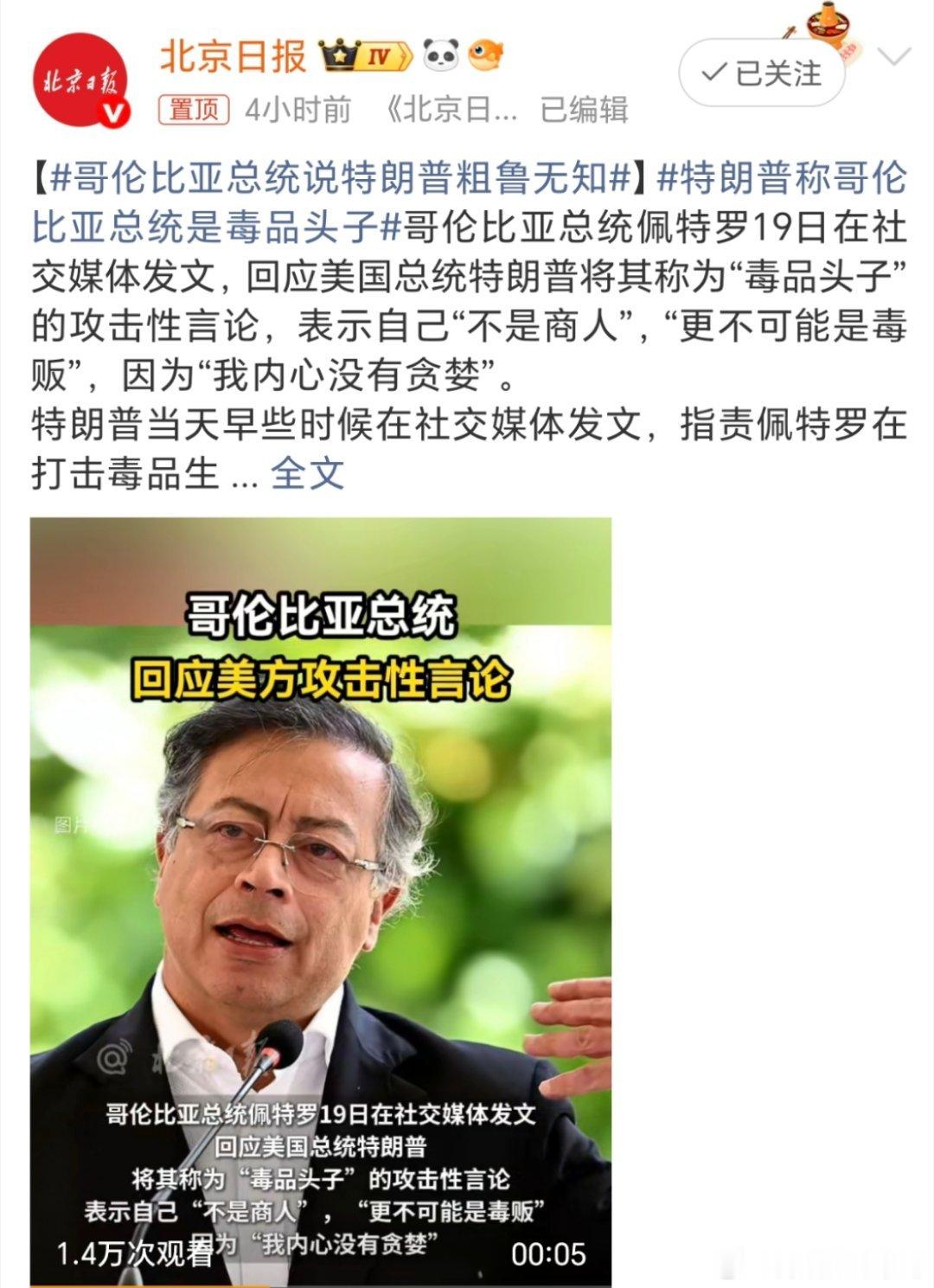 特朗普称哥伦比亚总统是毒品头子这是什么意思?直接就让他背锅了?[允悲][允悲][允悲][允悲]