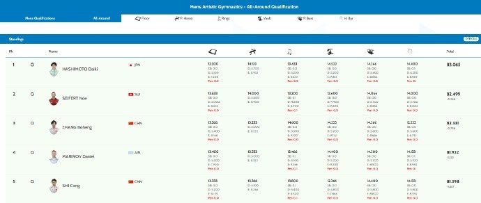 直播吧10月20日讯2025年体操世锦赛男子个人全能资格赛,张博恒总分82.331分排名第三,侍聪总分81.398排名第五,双双晋级决赛。
