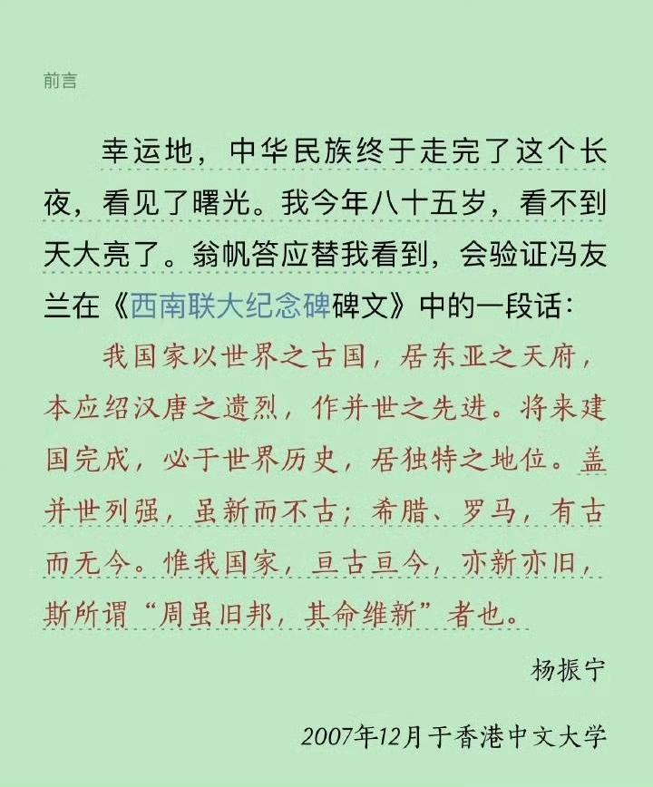 杨振宁先生在2007年说,幸运地,中华民族终于走完了这个长夜,看见了曙光。到了2017年他还说,看样子如果运气好的话,我自己都可能看到天大亮! 10月18日,杨老以103岁高龄辞世,而他期盼的“天大亮”,已在中华大地上变为生动现实。 杨老所言的“曙光”,大抵指的是在2008年举办的北京奥运会。那场举世瞩目的体育盛会,不仅是竞技的舞台,更是中国综合国力的集中亮相。 鸟巢、水立方等标志性场馆的建成,彰显了顶尖工程技术实力;赛事组织的井然有序,体现了高效的社会动员能力;全球44亿观众的收看记录,更让世界看到了中国开放包容的大国姿态。 正如国际奥委会评价,北京奥运会“为奥运历史树立了新标杆”,这束曙光让世界重新认识了崛起中的中国。 2016年的南海对峙,成为民族复兴进程中的重要转折点。面对外部势力的挑衅,中国军队坚定维护国家主权和领土完整,展现了捍卫核心利益的决心与能力。这场较量让国际社会清晰看到,中国的综合国力已不再受制于他国。 又或许正是基于这样的底气,杨老在2017年写作时,满怀信心地表示“曙光已转为晨曦”,并表示如果运气好的话,都可能看到天大亮。 此后的发展更印证了这一判断,2018年中美贸易战中,中国凭借完整的产业体系和广阔的内需市场,顶住外部压力实现经济稳步增长;2025年面对关税战升级,中国新能源、高端制造等产业的崛起,更凸显了经济结构的韧性与活力。 再到不久前的九三阅兵,为杨老的期盼画上了圆满句号。 这场阅兵集中展示了中国在国防科技领域的突破性成就,从隐身战机到新型舰艇,从智能装备到无人系统,一系列自主研发的尖端武器装备列阵亮相,既彰显了维护国家主权的坚定力量,也体现了科技创新的丰硕成果。 正如阅兵式所传递的信号,中国已站在新的发展高度,中华民族伟大复兴进入不可逆转的历史进程。 从2008年的曙光初现,到2016年的晨曦微露,再到2025年的天大亮,杨老的预言一一成为现实。这不仅是国家实力的跃升,更是无数像杨老一样的科研工作者默默奉献的结果。 中华民族的光明之路,既是奋斗出来的奇迹,也是对先辈期许最郑重的回应。