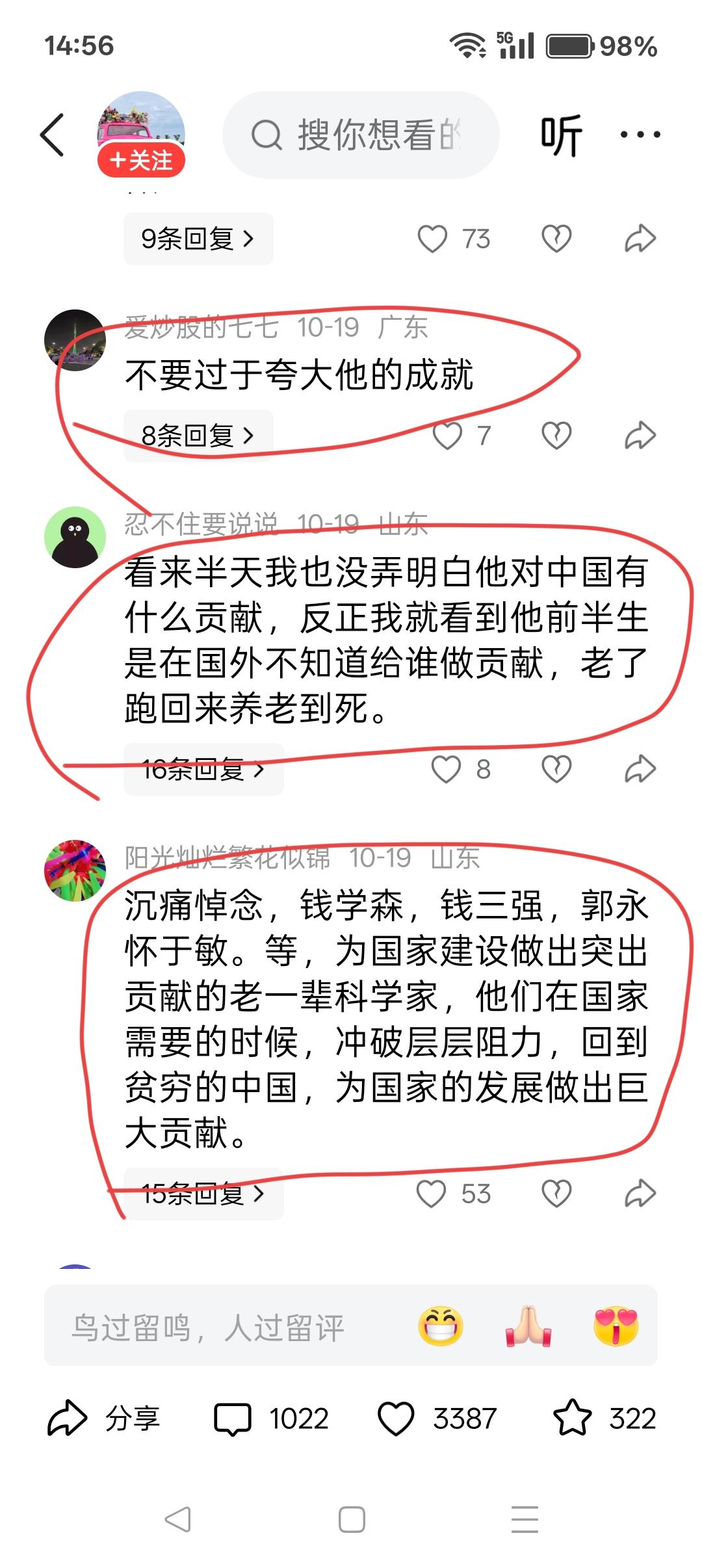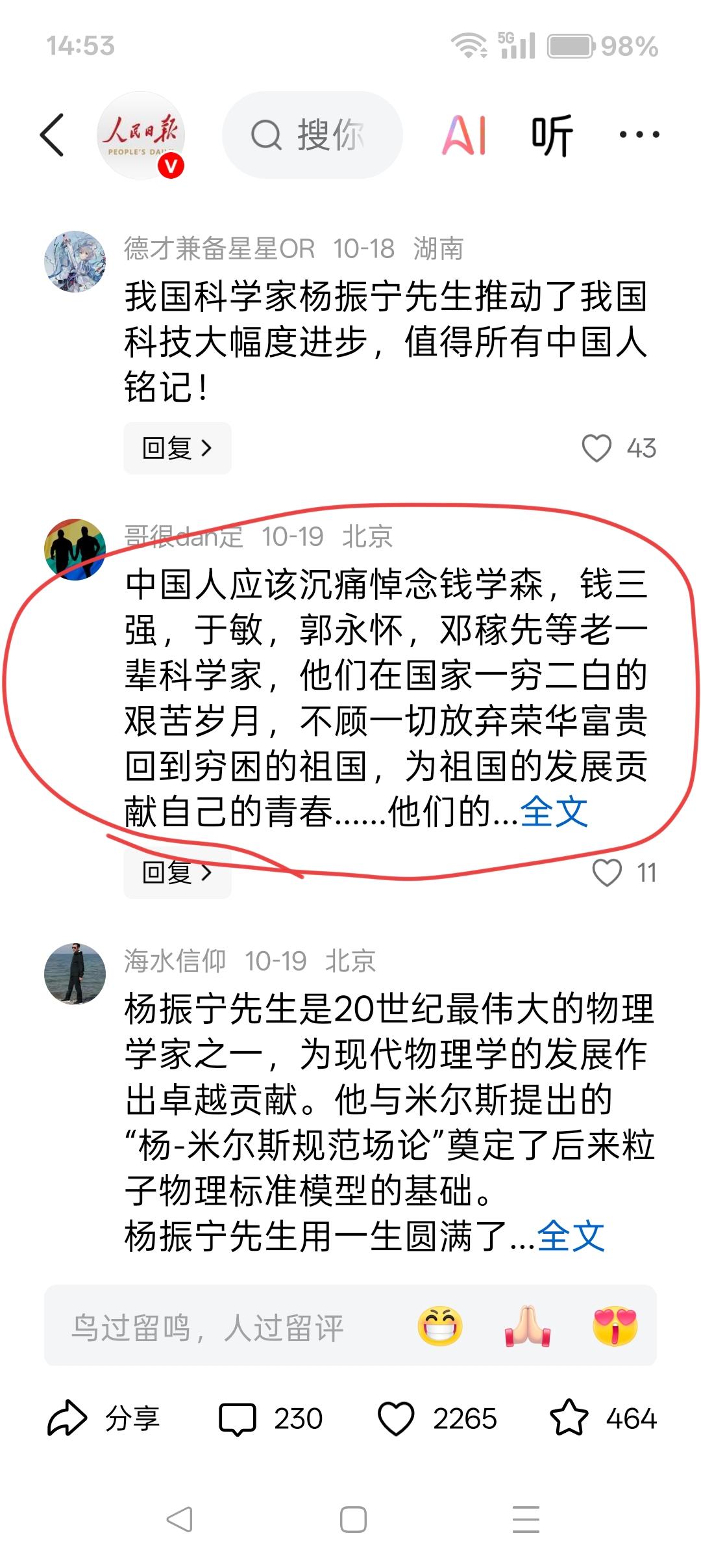 把杨振宁和钱学森对立,应被禁言或封号! 杨钱都是爱国的、有作为的中国公民,这一铁的事实,连国家和领袖都明确认可。 网上有些人,故意把钱学森与杨振宁对立起来,以钱学森的成就和贡献作为网暴工具,打压、贬低、抹杀杨振宁的成就和贡献。 他们无视杨钱的领域不同,否定杨在基础物理领域的世界级价值和对祖国的巨大贡献,坚决只承认钱的功绩。刻意把二人对立,仿佛二人是水火不容的仇敌,是高低贵贱分明的冤家,一个是君子、一个是小人……这已经污染了网络舆论环境。 说白了,他们就是坏。杨振宁的成就和贡献明明是可以搜索到的、是明摆着的、公认的。但是他们偏要睁着眼睛说瞎话,成天搬弄是非、编造矛盾对立,是不应该允许存在的负能量! 附: 钱学森生前说过:是国家需要杨振宁留在国外,他在国外的作用远比国内大 。