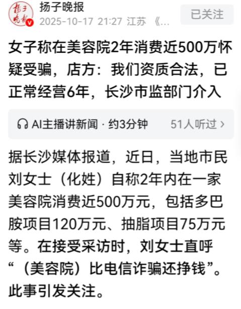 湖南长沙,刘女士在一家号称明星光顾的美容院,花了整整500万元,买了不知多少次“