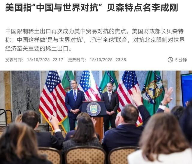 贝森特喊话中国,愿意放弃100%加税,但是稀土限制必须取消美国