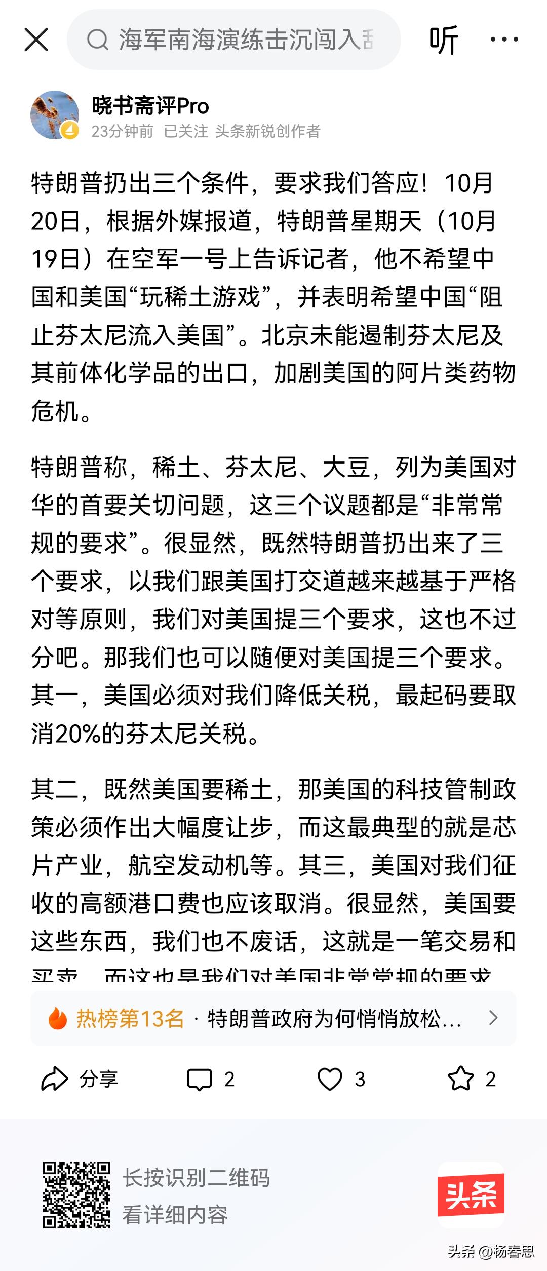 特朗普现在是不撞南墙不回头啊,他还有什么资本跟中国叫板吗,都这个时候了,他还想提出这些不合理的要求。他太想当然了。他的要求我们也可以答应,我们也可以提我们的要求嘛,前提就是:配合中国统一台湾,撤消中国所有关税,然后把嘴巴闭上别瞎咧咧!