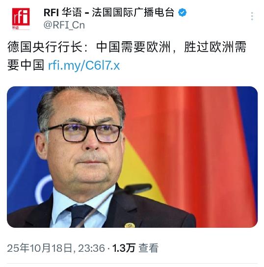外媒(10月18日晚)报道:“德国央行行长:中国需要欧洲,胜过欧洲需要中国。德国央行行长、欧洲央行管理委员会成员纳格尔表示,欧洲在与中国的贸易往来中需要‘采取更具攻击性的方式’,以保护自身及企业的利益。” 这话听着掷地有声,可真要拿中欧经贸往来的实际数据一核对,就知道站不住脚。 他提的那种“更具攻击性的贸易方式”,说白了就是没摸透中欧经济缠结的紧密程度,纯属空谈——现在中欧之间的经贸哪儿还是“谁离了谁活不了”的单行道啊,根本就是拆不开的共生体,你中有我、我中有你。 先从最实在的贸易盘子说起,2024年一年里,中国和欧盟之间的货物贸易进出口总额就达到了7858亿美元,这数字背后藏的是实打实的相互依赖。 对欧盟来说,中国早就是他们第一大进口来源地;咱们这边呢,欧盟也稳稳占着第三大出口目的地的位置,没哪一方能轻易把对方从自己的贸易版图里摘出去。 纳格尔说欧洲该搞“攻击性”那套,可真要这么干,最先疼的恐怕是欧洲自己的产业。 就说德国汽车业吧,2024年的时候,大众全球销量的一半、宝马全球销量的三分之一,再加上奔驰36%的全球销量,全靠中国市场撑着——等于中国市场直接托着德国车企的大半边天。 更有意思的是,就算现在中国汽车市场竞争越来越激烈,超过三分之二的德国车企还盘算着加大在华投入,重点放在研发和扩产能上。 要是真像纳格尔说的“中国更需要欧洲”,这些车企犯不着一门心思往中国市场里钻吧? 要说比汽车产业更能说明问题的,得看战略资源这块儿。现在欧洲一门心思搞绿色转型,不管是新能源汽车、风力发电,还是人工智能,哪样都离不了稀土。 全球85%的稀土加工产能都攥在中国手里,欧洲自己倒是喊着要五年内实现40%的加工自给,还拨了225亿欧元专门扶持,可现实哪有那么容易? 稀土提炼不光技术复杂,环保成本更是高到离谱——在欧洲处理提炼稀土产生的废水,成本比中国这边足足高出三倍还不止。 法国倒是有建精炼厂的想法,可就算真把厂建起来了,没有下游的配套产业链,炼出来的半成品还得拉到中国接着加工。 德国车企早就看清了这点,悄悄跟中国稀土企业签了长期供货合同,毕竟真要是断了供,欧洲的绿色转型立马就得卡壳。 纳格尔只说要“保护欧洲利益”,却压根不提欧洲的绿色目标,其实早被中国的稀土产业链攥在手里了。 再看高科技贸易这块儿,更能戳破“中国更需要欧洲”的说法。2024年欧盟进口的高科技产品中,有30%都来自中国,这部分货值就有1410亿欧元,比从美国进口的还多出7个百分点。 尤其是电子通信产品和计算机设备,中国差不多成了欧盟在这两类产品上的主要供应方。 欧洲对中国出口的高科技产品里,电子通信和航空航天占了大头,但要说依赖度,欧洲企业对中国市场的需求可一点不低。 就拿制药业来说,欧盟这块的出口量虽然不少,但主要市场是美国;可中国对欧盟的高科技出口,直接撑着欧洲的数字经济和制造业升级。 这种互补性,根本没法用“谁更需要谁”来简单概括。 纳格尔选在华盛顿IMF年会上说这番话,其实挺耐人琢磨的。 之前德国经济研究所刚出过一份报告,说中国在绿色科技领域的市场份额越来越大,欧洲产业界正犯愁呢,他这番话正好给这种焦虑找了个“外部原因”,本质上就是想靠制造对立来把欧洲内部的共识捏合到一起。 可现实是,欧洲自己出台的政策已经露了怯:2025年欧盟刚搞了钢铁进口配额削减,结果直接导致每辆乘用车的生产成本一下子涨了8%到12%,新能源汽车因为要用到特定钢材,受的冲击更严重,短期内钢铁产能缺口都快到120万吨了。 这种时候要是真对中国搞“攻击性贸易”,只会让欧洲车企的成本更高,在全球市场上更没竞争力,纯属搬起石头砸自己的脚。 从全球经济的大盘子来看,中国和欧盟的经济总量加在一块儿,能占到全球的三分之一还多,2024年这一年,两家对全球经济增长的贡献就有33%——说直白点,就是全球经济的两台大引擎。 真要是照着纳格尔说的,搞“攻击性”那一套,不光中欧之间的贸易要受影响,整个全球贸易格局都得跟着乱套。 IMF早就预测过,2024年全球经济增长只有3.2%,本来就够疲软的了,要是这两台大引擎闹起别扭,最后遭殃的肯定是全世界的经济复苏。 中欧之间有竞争不假,但更多的是你中有我的依赖关系——欧洲的高端制造业要靠中国市场托底,中国的产业链升级也需要欧洲的技术支持,就连绿色转型这种大事,也得绑在一起干才有效。 真要是脱离现实搞“攻击性”动作,最后只会像攥着沙子似的,越使劲漏得越快。毕竟贸易合作的本质是互利共赢,不是谁压过谁,这点不管是德国车企,还是中国的稀土企业,心里都门儿清。