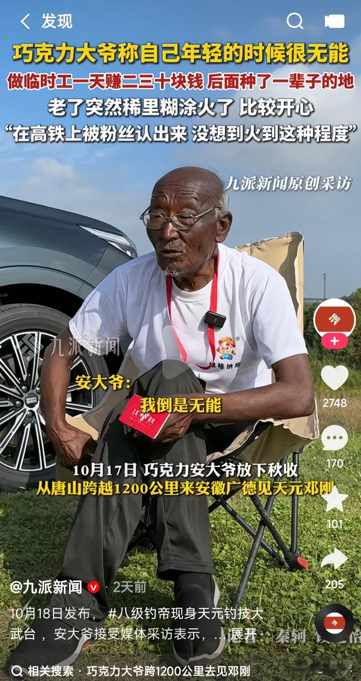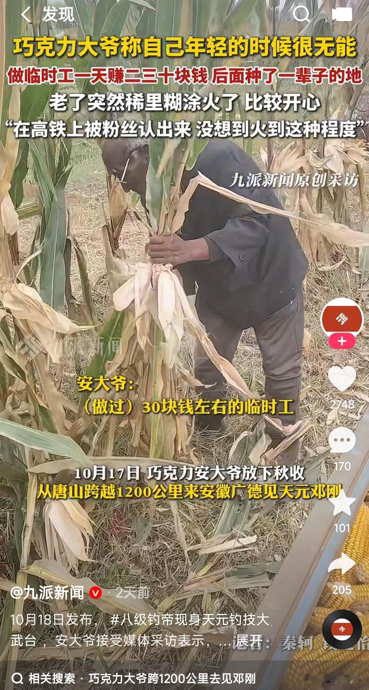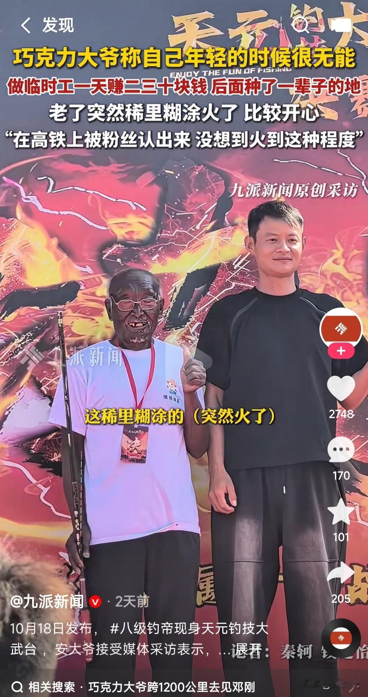 这帮人也真能瞎扯,巧克力大爷说他一辈子种地务农,他们居然翻译成一辈子无能,老了还稀里糊涂的火了,大爷也成名人了。 这就是所谓的时也命也吗?这巧克力大爷种了一辈子地,闲时钓钓鱼,没想到却因为晒黑了突然之间就火了,这果真是大爷的兴趣爱好最终把大爷给捧成名人了,也不是大爷种地种的出色,也不是大爷钓鱼的技术好,而是大爷为了钓鱼不怕风吹日晒的定力好。 这种稀里糊涂的的就火了,真是让人有点意外,有些人为了火不择手段,什么幺蛾子办法都能使出来,最终还是没火,然而有些人为了自己的兴趣爱好夜以继日的天天坚持着,莫名其妙稀里糊涂的的就火了,这种火还真让人有点意外,也许一切都是天意,一切都是命中注定的。