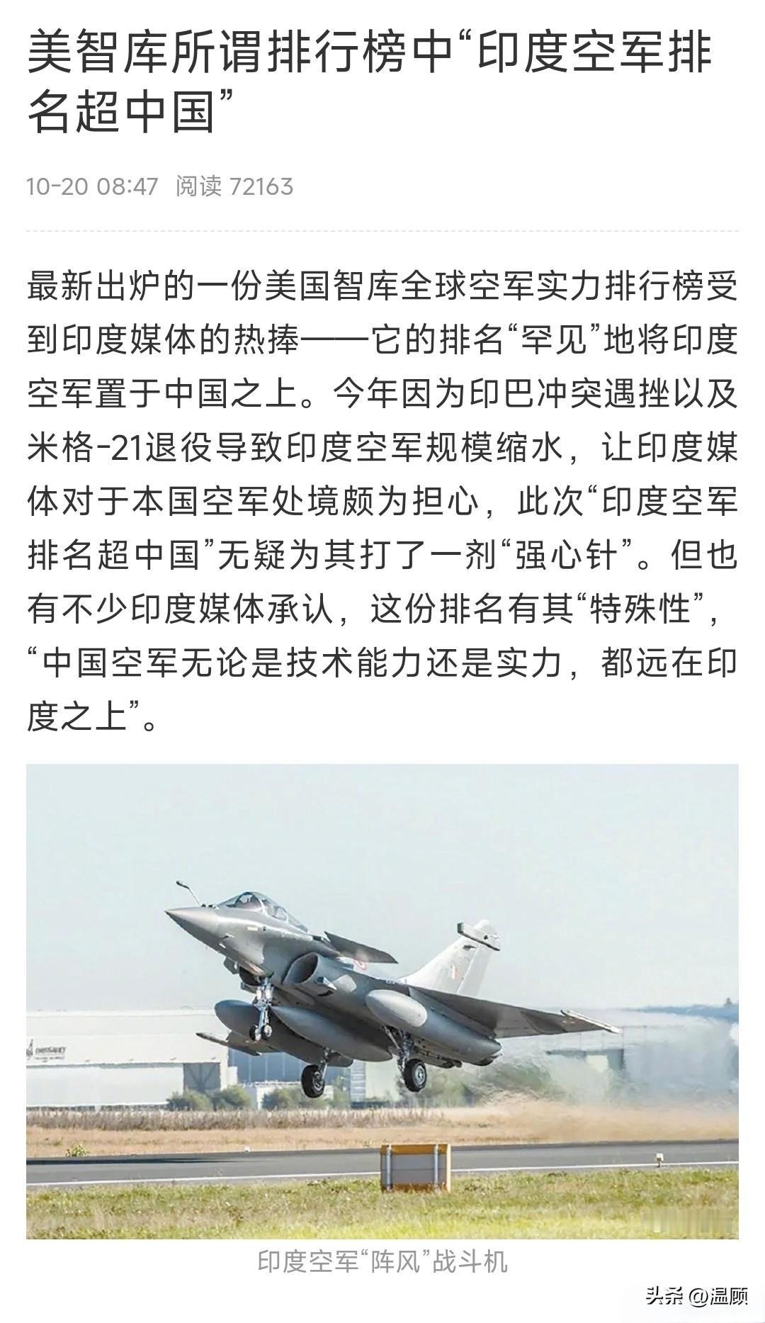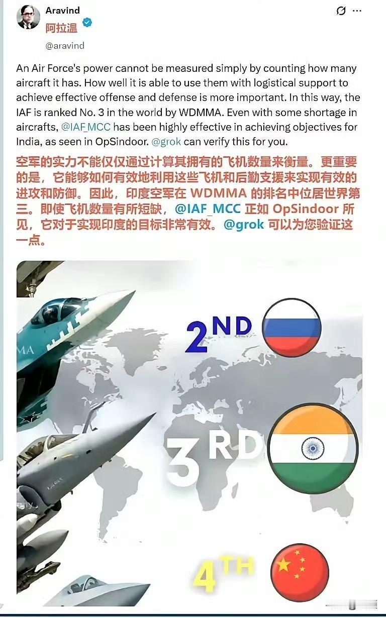 印度砖家详解缘何空军排名第三力压中国? 美国智库“世界现代军用飞机名录”(WDMMA)发布的最新排名,美国空军凭借5004架军用飞机的总量和242.9分的总分排在第一,拥有3677架军用飞机的俄罗斯空天军以114.2分排名第二,印度空军以1716架军用飞机和69.4分超过中国空军(3722架军用飞机,63.8分),排名第三。 根据该排名,排在后面的各国空中力量分别是日本(58.1),以色列(56.3)、法国(55.3)、英国(55.3)、韩国(53.4)和意大利(51.9)。 对于力压中国,印度专家解释称,空军实力不能仅以飞机数量衡量,更要看后勤支持下的攻防效能,因此印度空军在WDMMMA排名中位列世界第三,还以“OpSindoor”行动为例说明其有效性。 其实阿三家专家不用忙着解释,对于这个排名,阿三高兴,中国也没意见,就是把取得6:0战绩的小巴排后面是不是有点不合适……