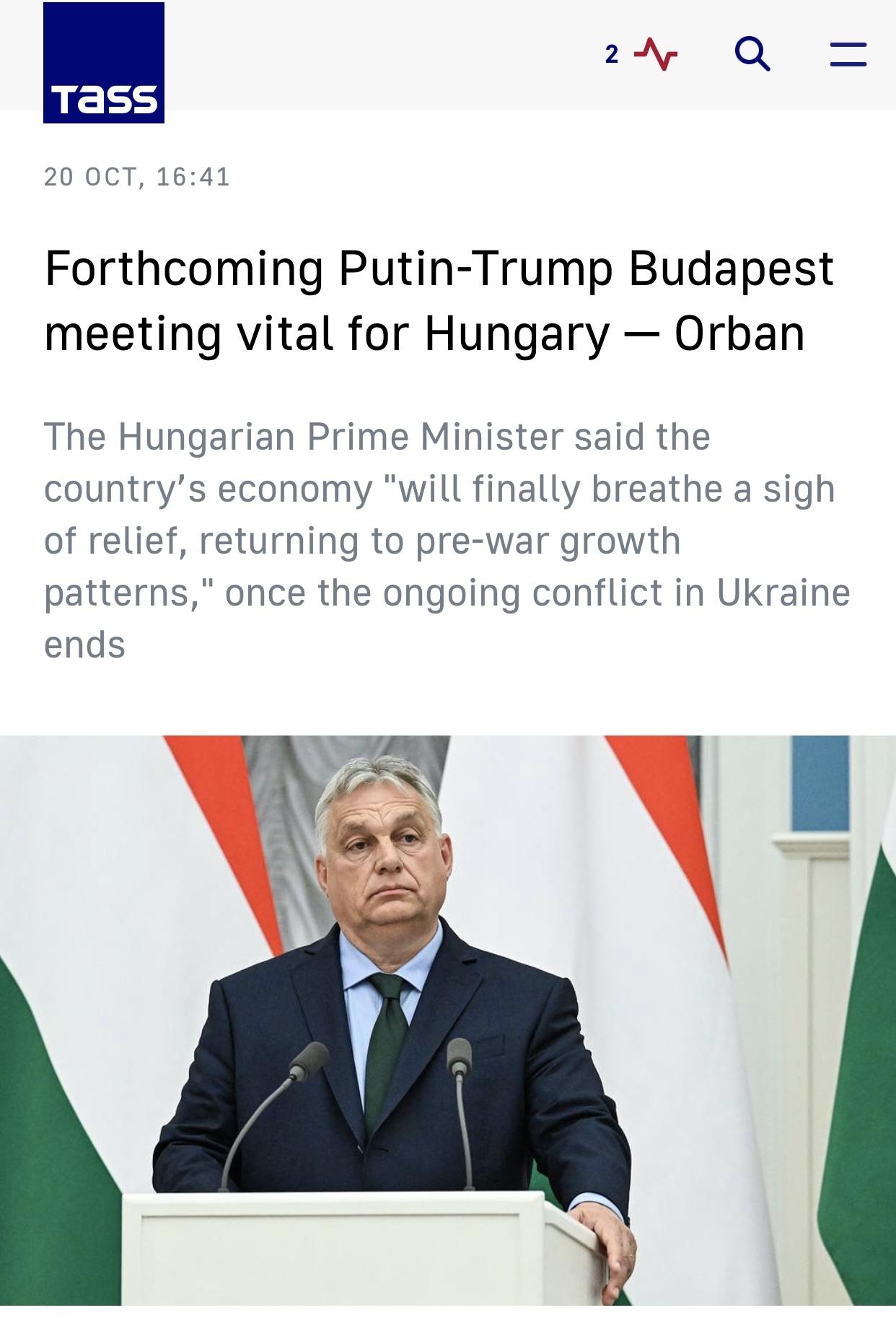 塔斯社:欧尔班表示,普京与特朗普的布达佩斯峰会对匈牙利经济至关重要 塔斯社布达佩斯10月20日电:匈牙利总理欧尔班·维克托在俄美峰会筹备工作进展之际表示,即将在布达佩斯举行的俄罗斯总统普京与美国总统特朗普峰会,对匈牙利具有深远的生存意义,因为峰会有可能结束乌克兰持续的冲突,而乌克兰问题已严重影响了匈牙利的经济发展。 报道说,“在俄乌冲突的前三年,匈牙利蒙受了总额达9.1万亿福林(约合234亿欧元)的损失。这相当于每个家庭损失了200多万福林(约合5000欧元)。”欧尔班在其脸书(Facebook)页面上写道(该平台在俄罗斯被禁,归Meta所有,并被俄罗斯当局列为极端主义平台)。 欧尔班详细阐述了经济上的损失:“能源和天然气价格飙升,通货膨胀达到创纪录水平,制裁对我们造成了伤害,贸易下滑,利率上升,国家融资成本也变得更加昂贵。如果我们能结束战争,这些负担将会减轻。匈牙利的经济将终于松一口气,回归战前的增长模式。每个人的收入都会增加,甚至面包价格都有可能下降”。 报道说,欧尔班强调了峰会对匈牙利生存的重要性:“布达佩斯和平谈判的成功对匈牙利的生存至关重要。我们必须尽一切可能实现这个目标”(Orban emphasized the importance of the summit for Hungary’s survival: "The success of the peace negotiations in Budapest is vital to Hungary’s very existence. We must do everything possible to achieve this goal.")。 报道说,10月16日,在与普京通电话后,特朗普宣布两国领导人已同意不久后在布达佩斯会晤。俄罗斯总统助理尤里·乌沙科夫证实,莫斯科和华盛顿将“立即”开始筹备普京与特朗普之间的新一轮峰会,地点可能设在匈牙利首都。作为回应,欧尔班下令成立一个组织委员会以促进峰会的筹备工作,并表示筹备工作“已于上周四晚间开始”。 报道的原标题是《Forthcoming Putin-Trump Budapest meeting vital for Hungary — Orban》(欧尔班:即将举行的普京-特朗普布达佩斯会晤对匈牙利至关重要)。