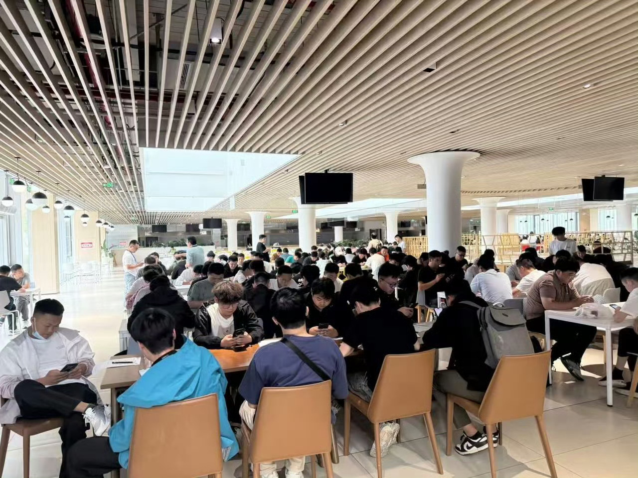 办公室确实没办法同时容纳这么多人应聘,食堂是个高效率的好地方。待遇看了一下,感觉还不错。
