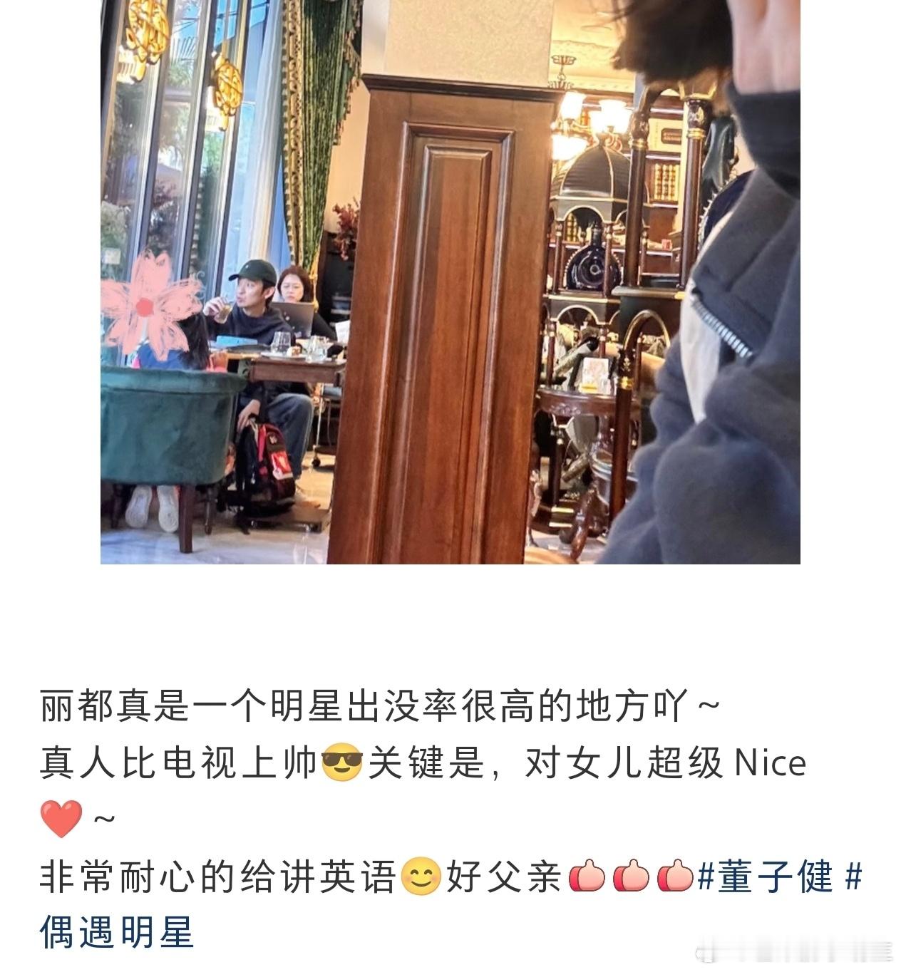 董子健带女儿喝下午茶董子健耐心的给女儿讲英语 董子健带女儿喝下午茶被偶遇,网友描述董子健在给女儿讲英语,对女儿特别有耐心,夸他是个好父亲。