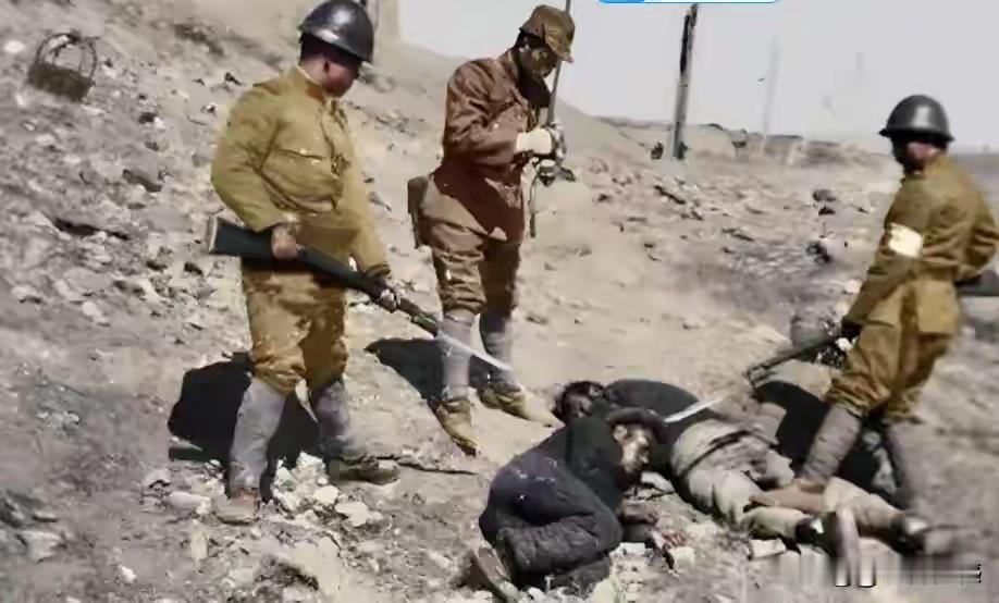 这两个老百姓在日本鬼子面前,就像待宰的羔羊一样,那样的绝望,是那样的可怜,是那样的无助,这三个日本鬼子像凶神恶煞一样,其中两个日本鬼子端着刺刀,另一个日本鬼子好像在本子上写着什么东西,也好像是在摆弄照相机,这两个老百姓在日本鬼子面前,佝偻着身体,一个趴在地上,一个斜卧在地上,不知道这时候他们是否还活着,不知道最后他们的命运怎样!