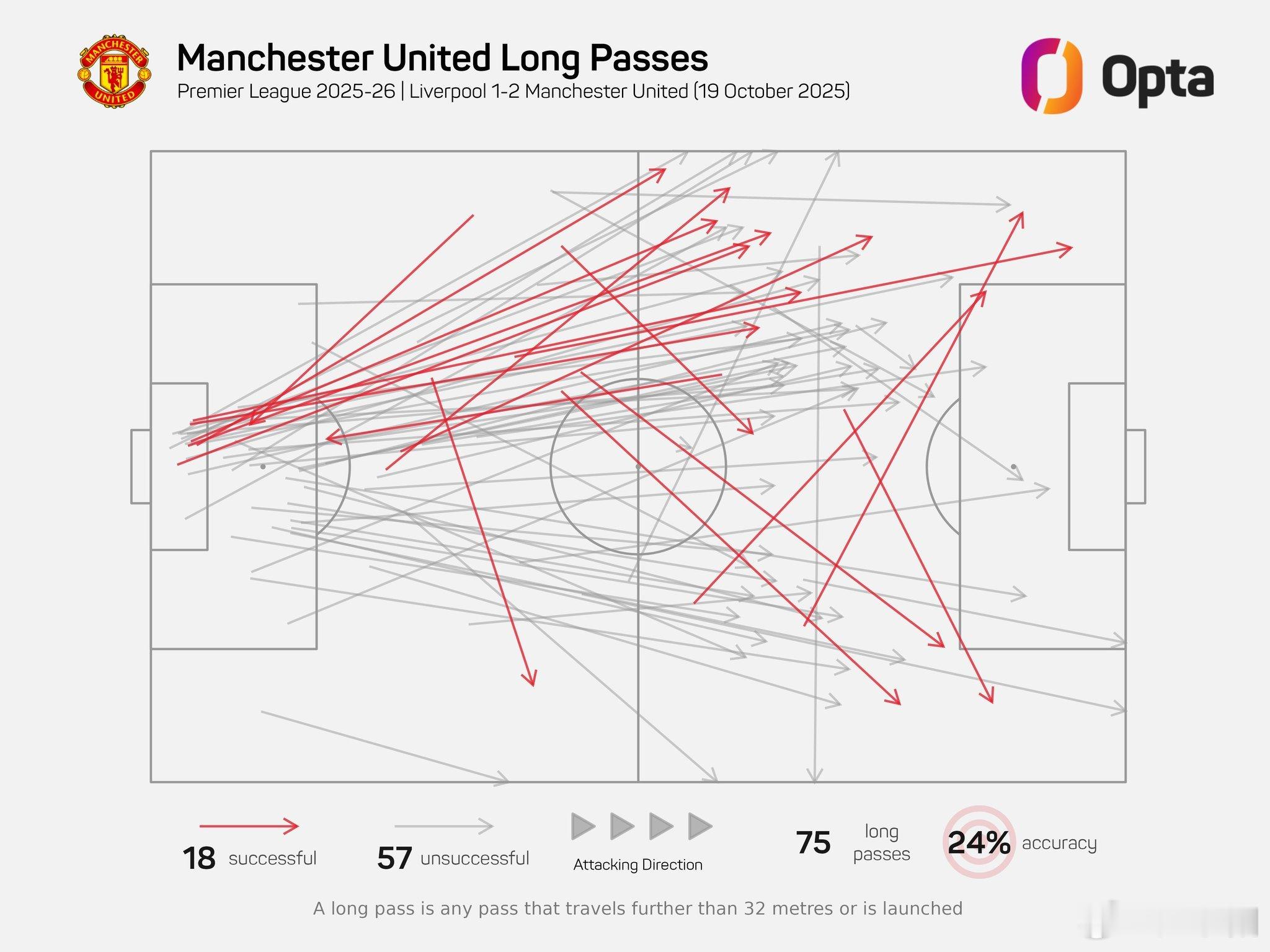 利物浦1比2曼联 如下图中所示,昨晚曼联客场对阵利物浦的比赛,曼联总共完成的294 次传球中,有 75 次是长传,占比25.5 %。