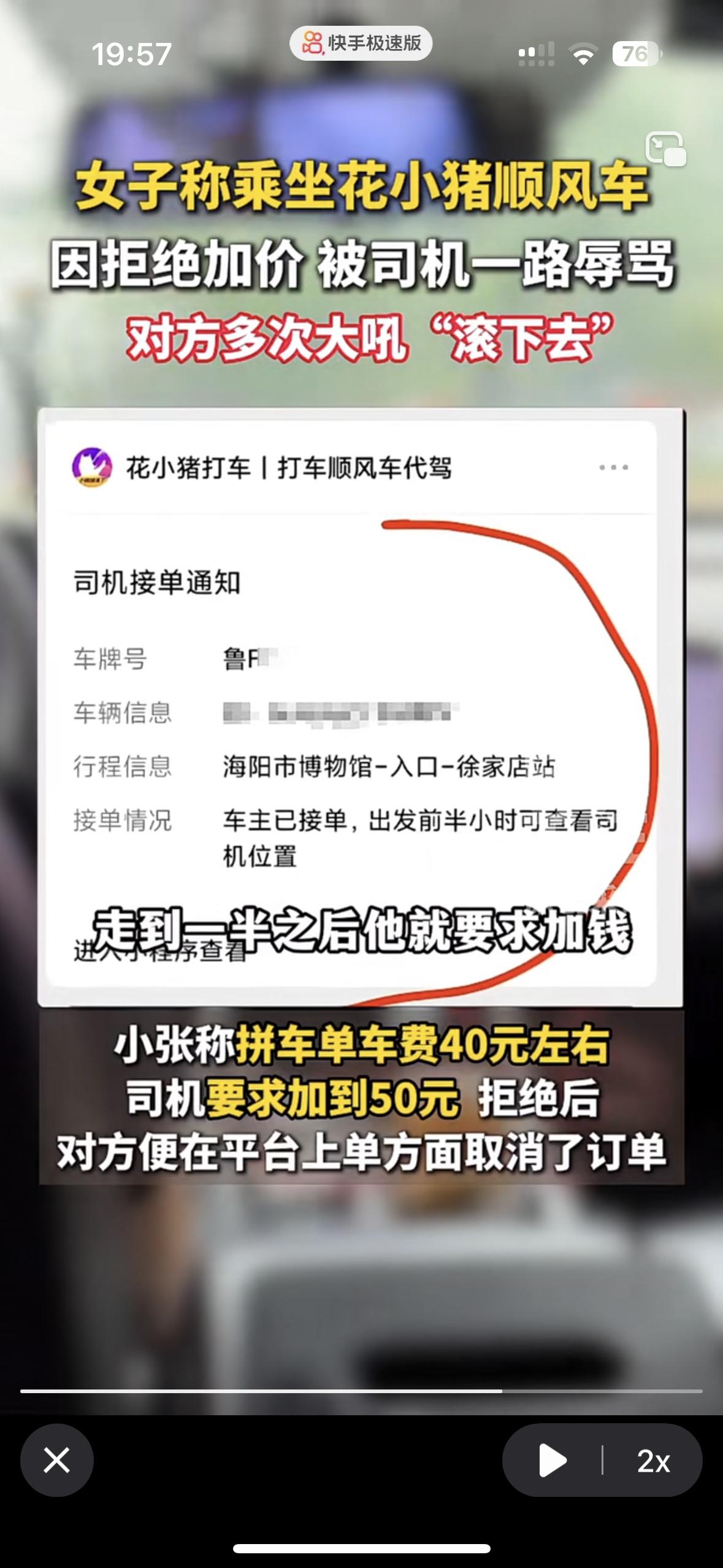 真给山东人丢脸!哪里是好客山东,这是骂客山东吧 乘客去山东烟台用花小猪软件打车因拒绝司机师傅加价,被司机辱骂一路 司机师傅说平台有抽成让乘客线下交易,为了多赚几块钱,乘客答应了,没想到半路司机突然要求多加10块钱,本来40的路程,他要50 不同意,司机就让她滚下去下车,这分明就是宰客呀!太给山东人丢脸了吧