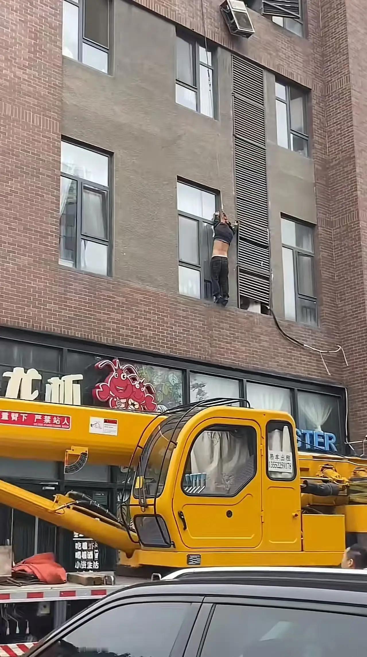 北京丰台惊魂一刻!工人拆空调失足悬空命悬一线数十群众拦吊车生死营救英雄司机空