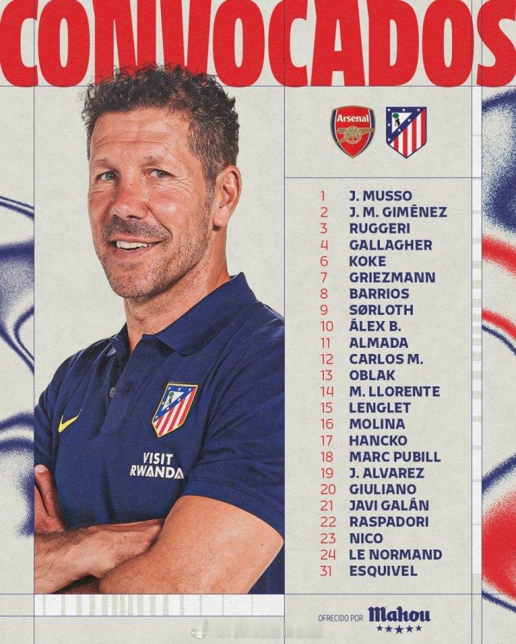 马竞公布欧冠客战阿森纳名单,这场应该挺有意思的,传统意义上的钢铁防守对上八大金刚