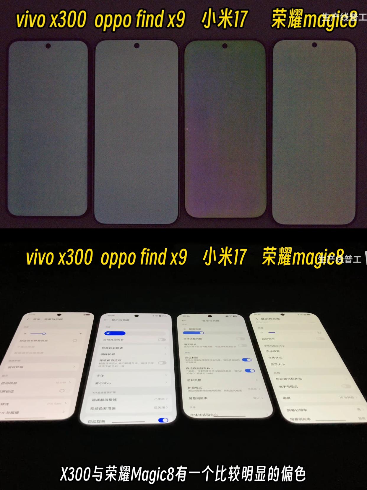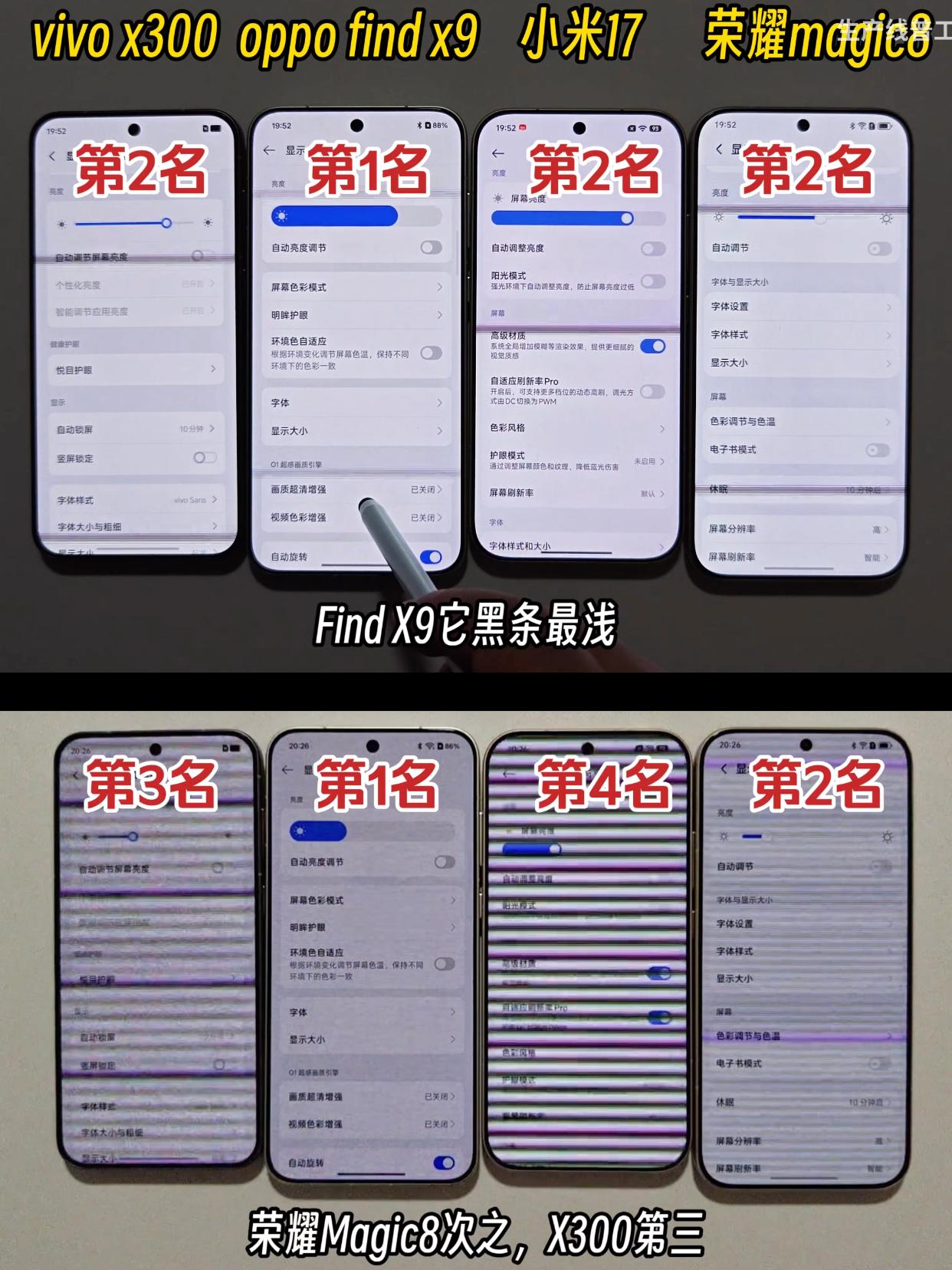 都是旗舰新机,原来屏幕差距这么大啊?? 😂看网上博主的测试,原来这波国产新机的屏幕差别这么大啊?一个个都说自己护眼,实际测试出来结果差好多 vivo X300、OPPO Find X9、小米17、荣耀Magic8这四台标准版旗舰,都说自己能1nit亮度,但实际在1nit的情况在色彩均匀性、亮度一致性差别好大哦,画面最干净的就是OPPO了吧,睡觉前喜欢刷手机的舒服了 偏色的测试也是Find X9表现更好,平时喜欢把手机放桌子上看的应该很重视这个。大部分人最关心的频闪问题,表现最好的居然还是Find X9,长时间用手机最需要关注的就是频闪了,频闪表现好的看久了不容易眼干 看样子,OPPO发布会上说在屏幕方面投资50亿确实看到水花了呀~ (图源:生产线普工)
