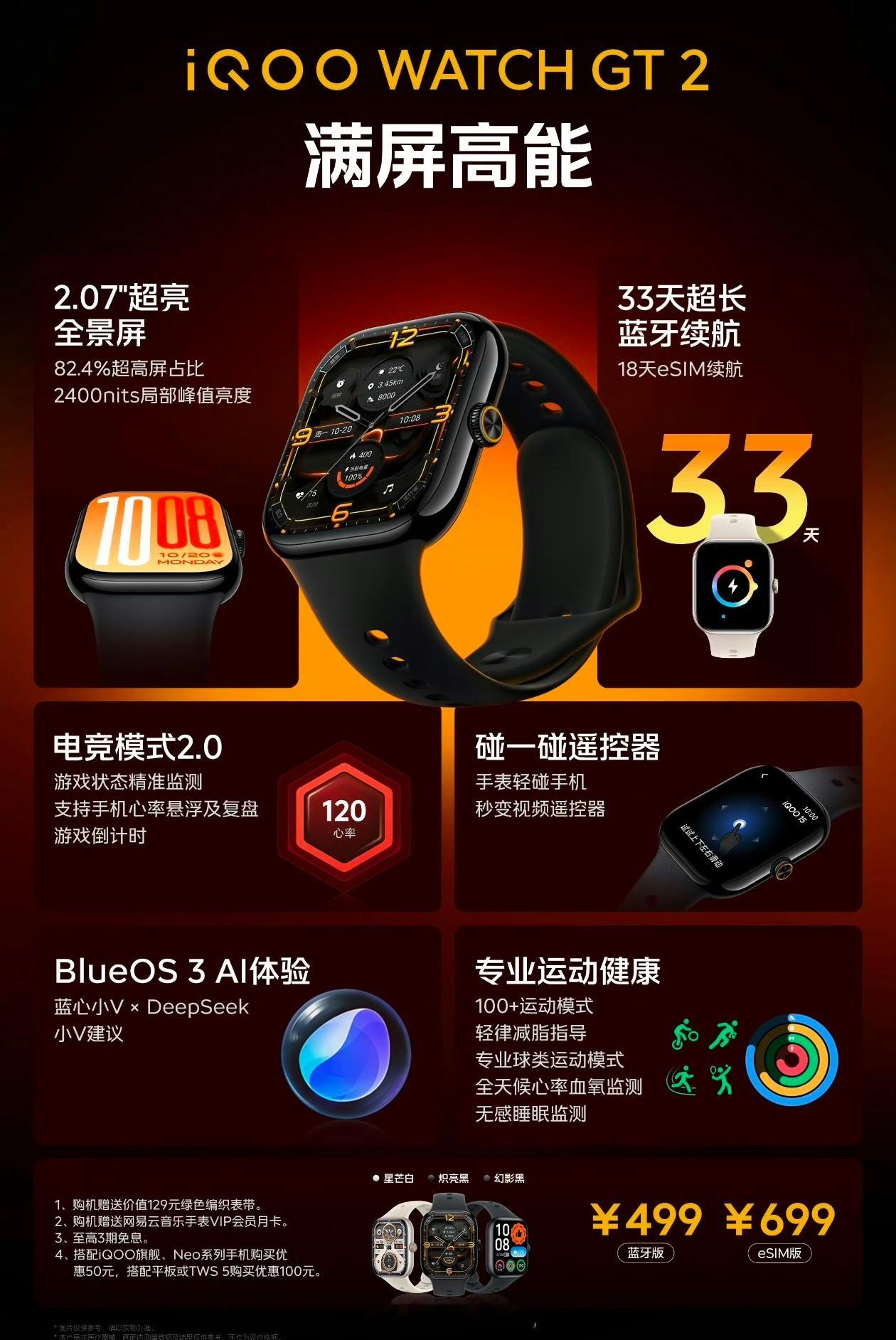 iQOO Watch GT2:2.07寸,33天续航,Blue OS3,价格499