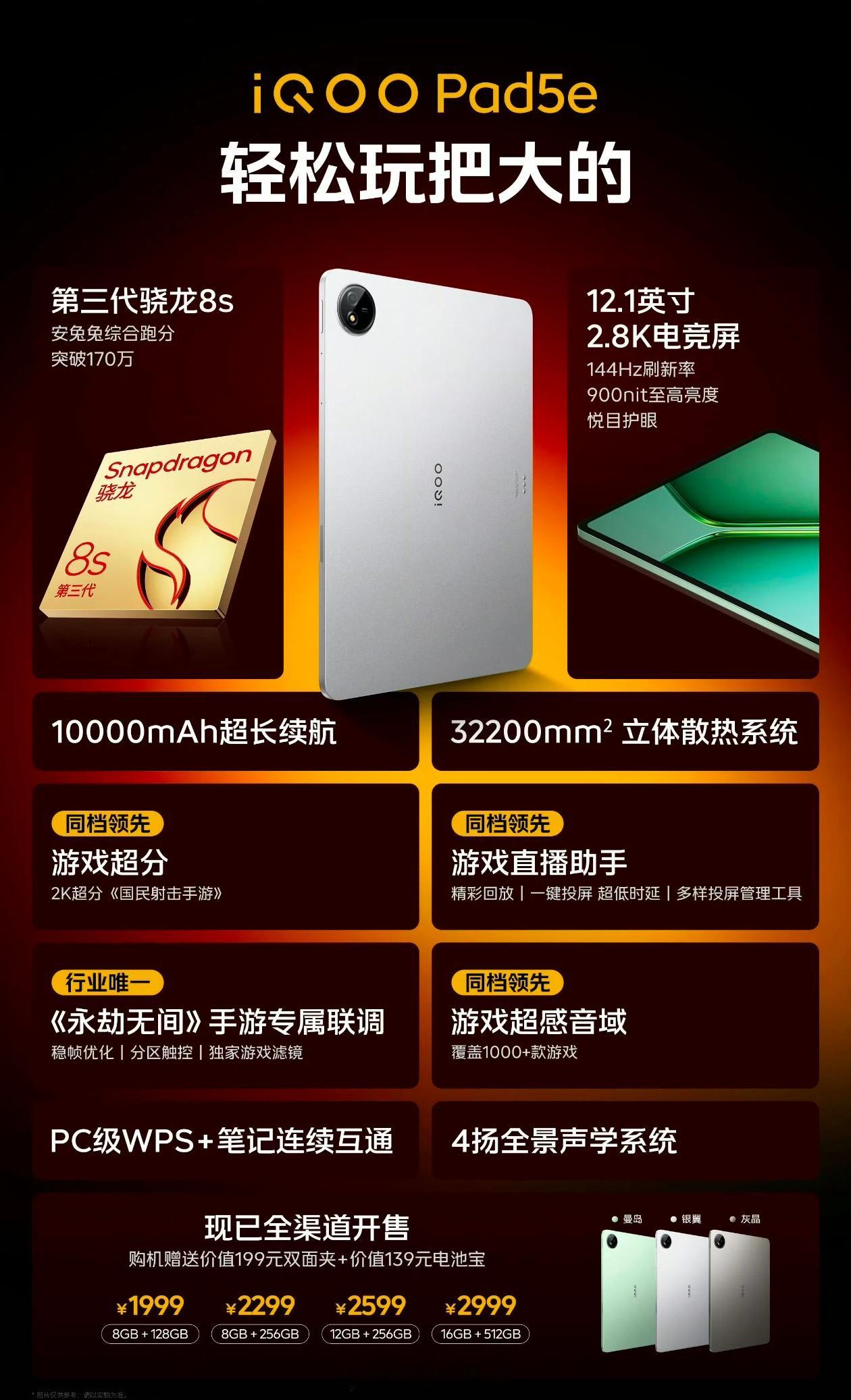iQOO Pad5e:三代骁龙8s,12.1寸2.8K屏幕,10000电池,8+125GB 1999,12+256GB 2599