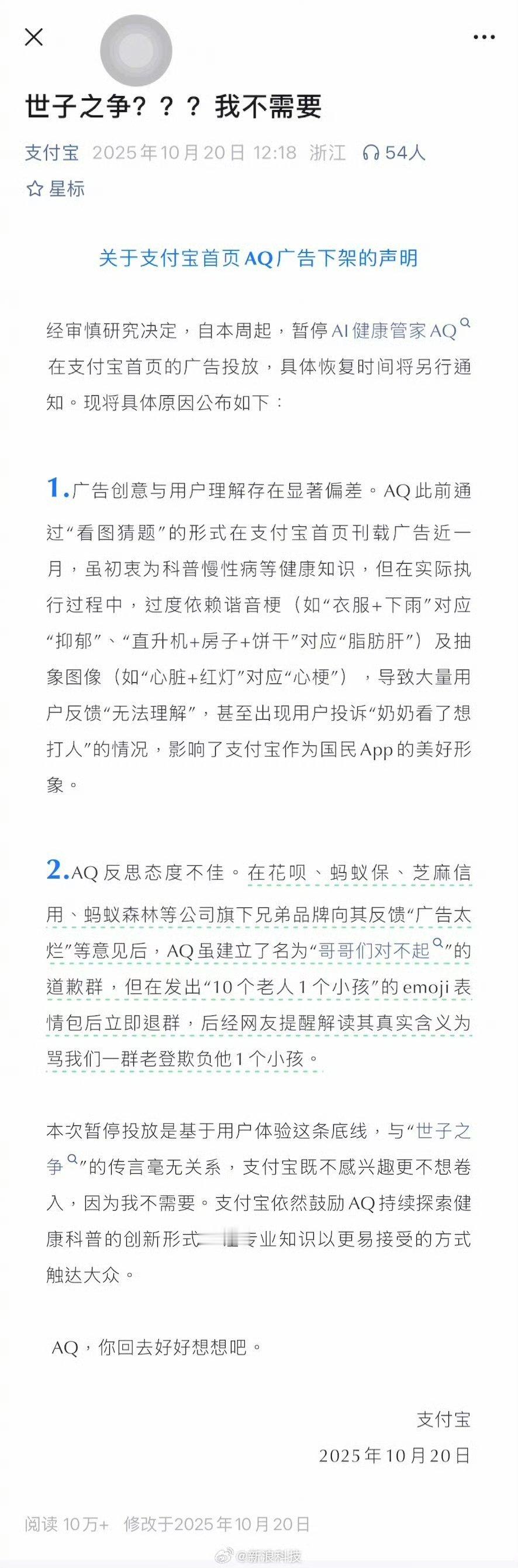支付宝回应内斗传闻吃瓜群众表示,这波操作比广告本身精彩多了!谐音梗广告让人摸不着头脑,团队道歉还上演“退群文学”,堪称职场大戏。官方声明虽极力否认内斗,但“老登欺负小孩”的剧情已让网友脑补万字小说。国民应用果然连瓜都更接地气。