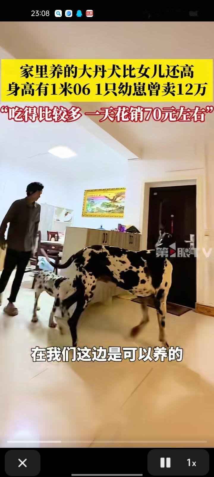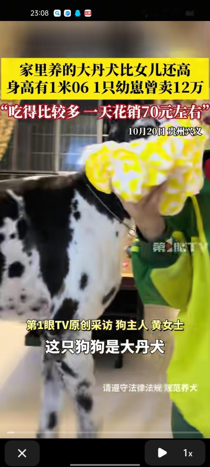 10月17日,黔西南州兴义市。孩子妈妈发视频称,家养的大丹犬比自己的女儿还高,身高一米六,体重160斤,不细看的话以为客厅养了一匹马。本来是想申请吉尼斯纪录的,在这边是可以养的,从小就养着陪女儿一起长大。它属于家庭伴侣犬,很温顺但花销很大,吃的比较大,一天吃的花销大概70元左右。一只大丹犬是五万元起步,曾经卖到国外是12万元一只