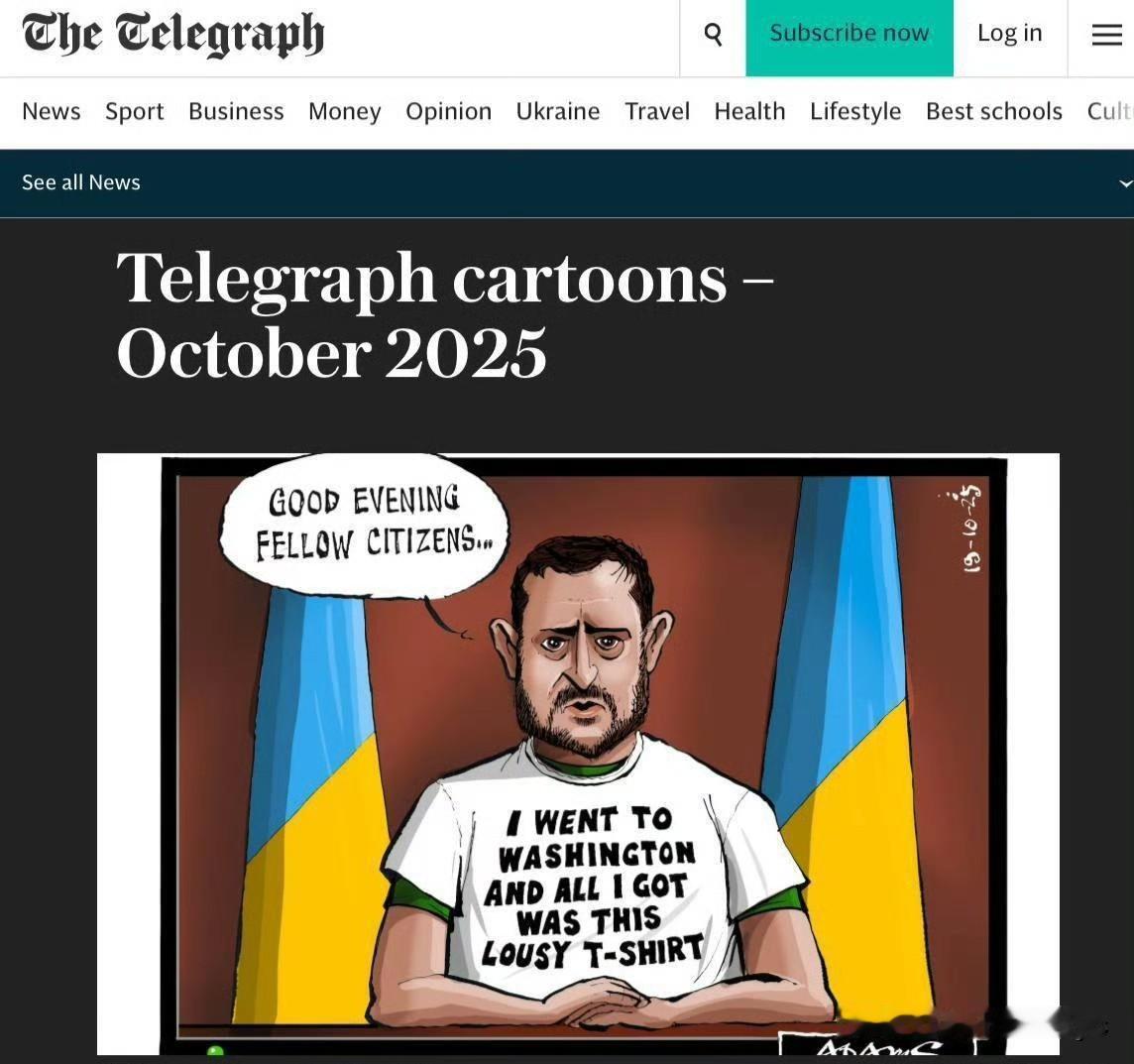 10月17日,泽连斯基“二进宫”,“战斧”没捞到,还被要求以目前交战前线划边界。两手空空不说,还饱受其辱:倒是一幅描述泽连斯基此行的漫画火了,“我去了趟华盛顿,结果只得到这件破T恤”。