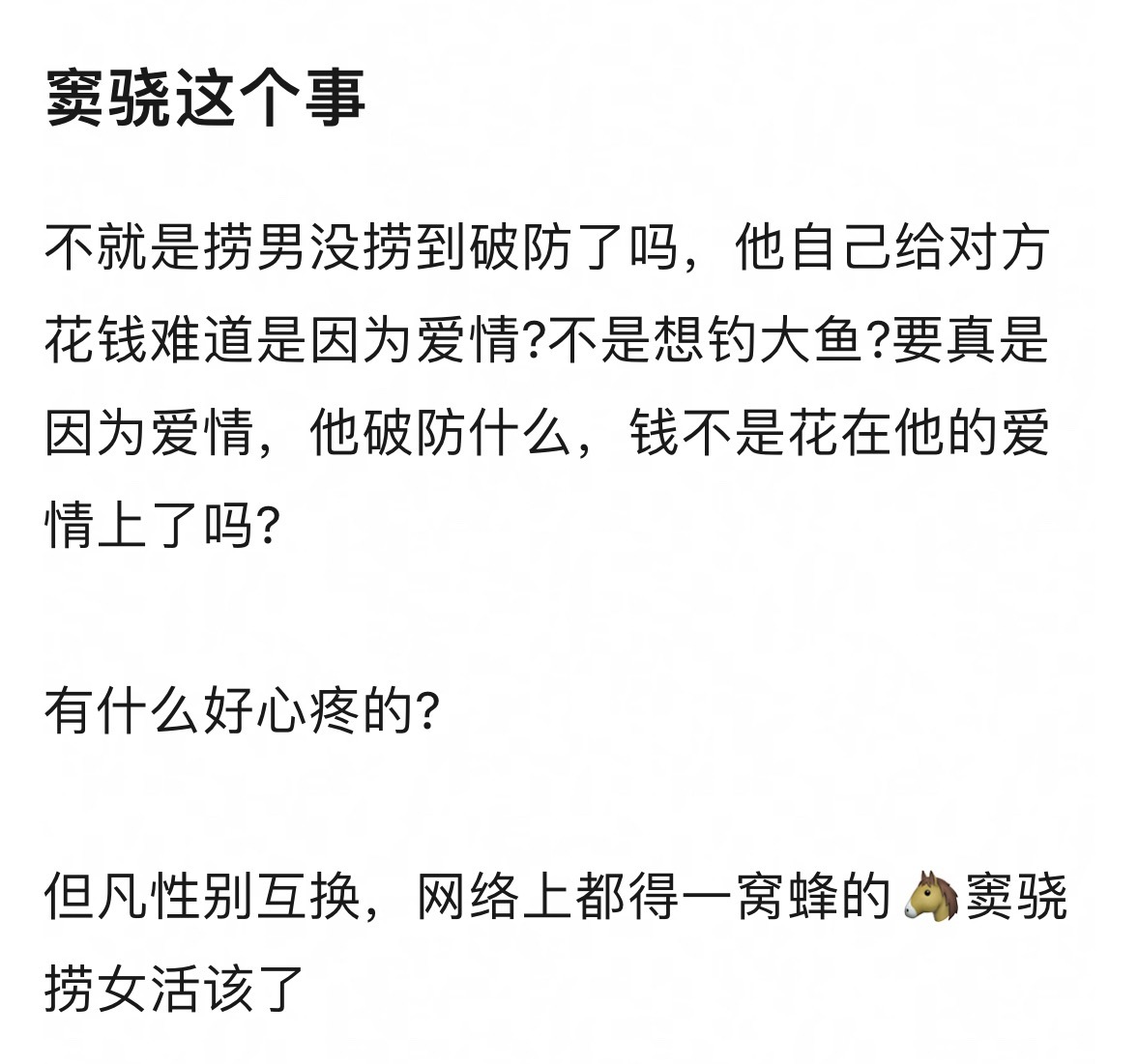 有网友认为:窦骁这个事,是捞男没捞到破防了,性别一换,就可怜上窦骁了…