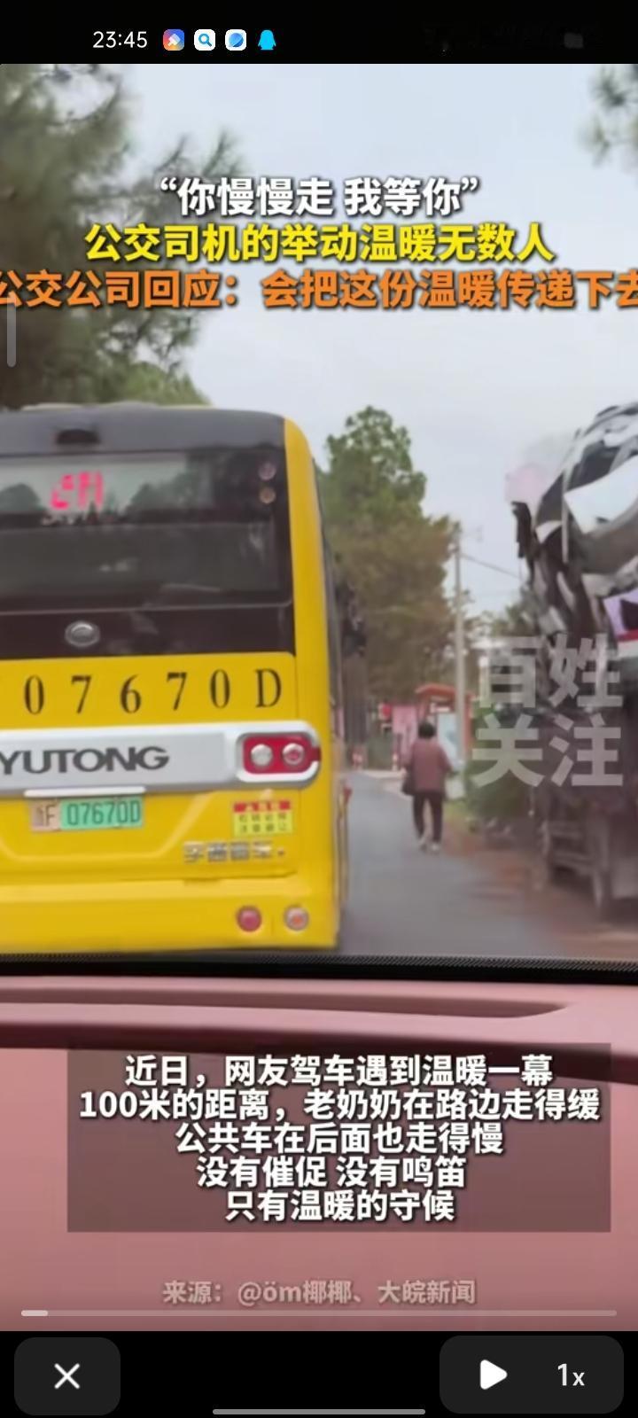10月19日,浙江嘉兴。网友发视频称,100米的距离,老奶奶在路边走的缓慢,公交车在后面也走得慢,没有催促和鸣笛。 据了解,这位公交司机名叫金利军,今年52岁,来自嘉兴市嘉通交运集团公交四分公司,从事244路公交驾驶已经11年时间 嘉兴市嘉通交运集团有限公司工作人员沈女士表示,公司已关注到驾驶员的暖心举动,会把他的事迹作为优秀案例进行传播,让其他驾驶员也以此作为服务标准。 想想看,如果我们不重视老人,老奶奶的心情会是什么样的。城乡公交的间隔时间就是长,人口密度低,居住分散的地区一天发三四趟的车也有,正常反应都是看见车停在车站了就跑过去追。所以说,公交司机做的太到位了,慢下来的几十秒,不是延误,是温度。