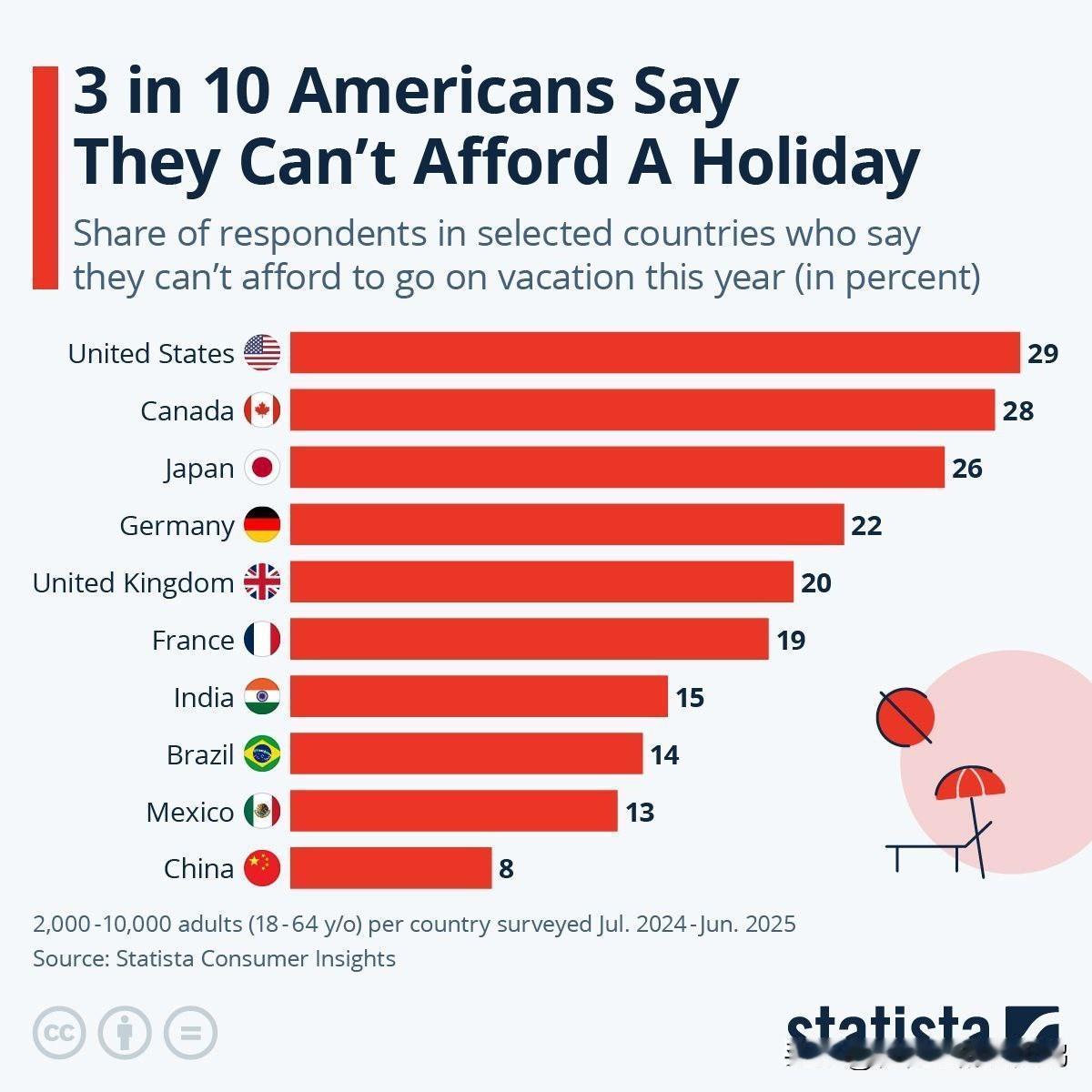 在权威数据统计机构Statista调查的十个国家中,美国出人意料地成为了无法负担度假费用国家排行榜中的榜首。 30%的受访美国人表示他们负担不起度假费用…… 排在其后的分别是,加拿大、日本、德国、英国、法国、印度、巴西、墨西哥和中国。 而仅有8%的受访中国人表达了与受访美国人一样的观点。 前十里G7集团成员国就占了6个,这在三年前是根本无法想象的。而被G7集团极限制裁(3万多条制裁)的俄罗斯却不在前十之列。 讽刺不? MAGA! 这明明是正在开启“节衣缩食,高筑墙、广积粮、缓称王”时代。 #苑举正解读中美关税战再升级# #特朗普与泽连斯基再度激烈争吵# #热点解读# ​​​