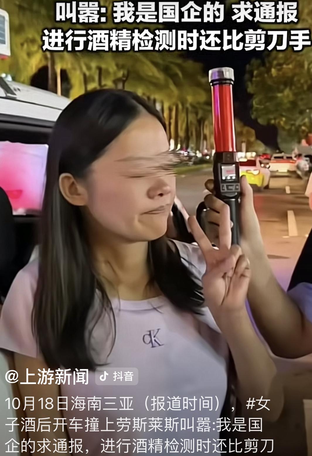 出事后叫嚣求通报,酒精测试比划“剪刀手!”这名女子的结局或许连她都不知道会是怎样的结果。 10月14日晚,海南三亚某国企下属二级公司女员工酒后开车与一辆劳斯莱斯发生刮碰,事故发生后,有网友将视频发到网上。视频中,女员工说“我是国企的,让市委市政府通报我好了!”从语气里看出她的无奈,没觉得她强点自己国企身份就特有优越感,而是在求同情。 现在交警抓酒驾,先问单位,处罚是直接发到单位,没有一点回旋余地!所以女子对交警说的意思是“我们单位处罚力度太大了,我有点承受不住,你能不能看在我不容易的份上别告诉我单位?” (来源:上游新闻) 国企喝酒被查到处罚很严厉,处分+通报批评,三年内评优啥的与你无关,奖金也没了,醉驾的话直接劝退。她这个100%直接开除,谁来说话都没用。这下啥都没了,保险不赔,工作也没了,一个女的喝酒了为啥不叫代驾?或者打车回家,逞能只能是错上加错。