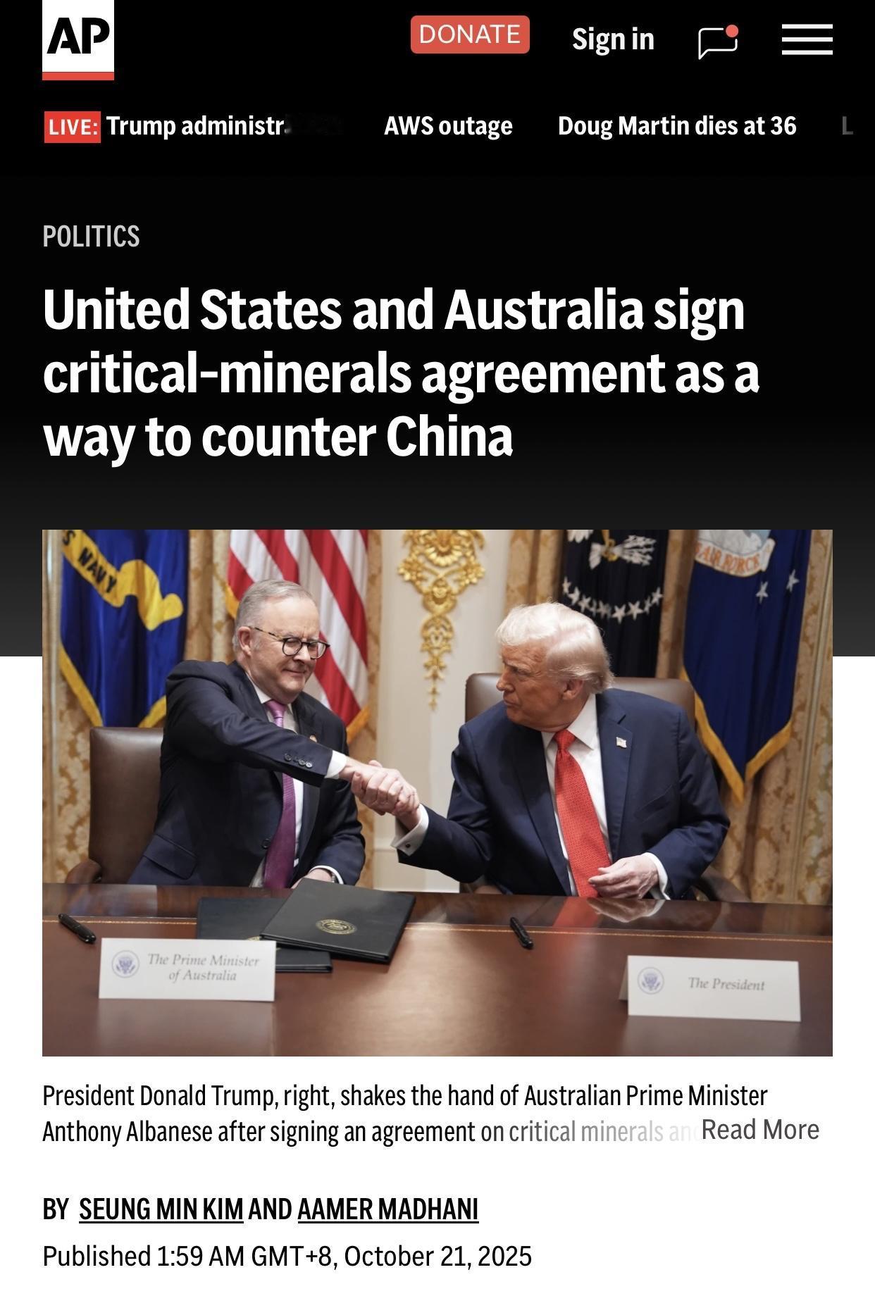 美联社:美澳两国签署关键矿产协议 美联社华盛顿10月21日电:周一,美国总统