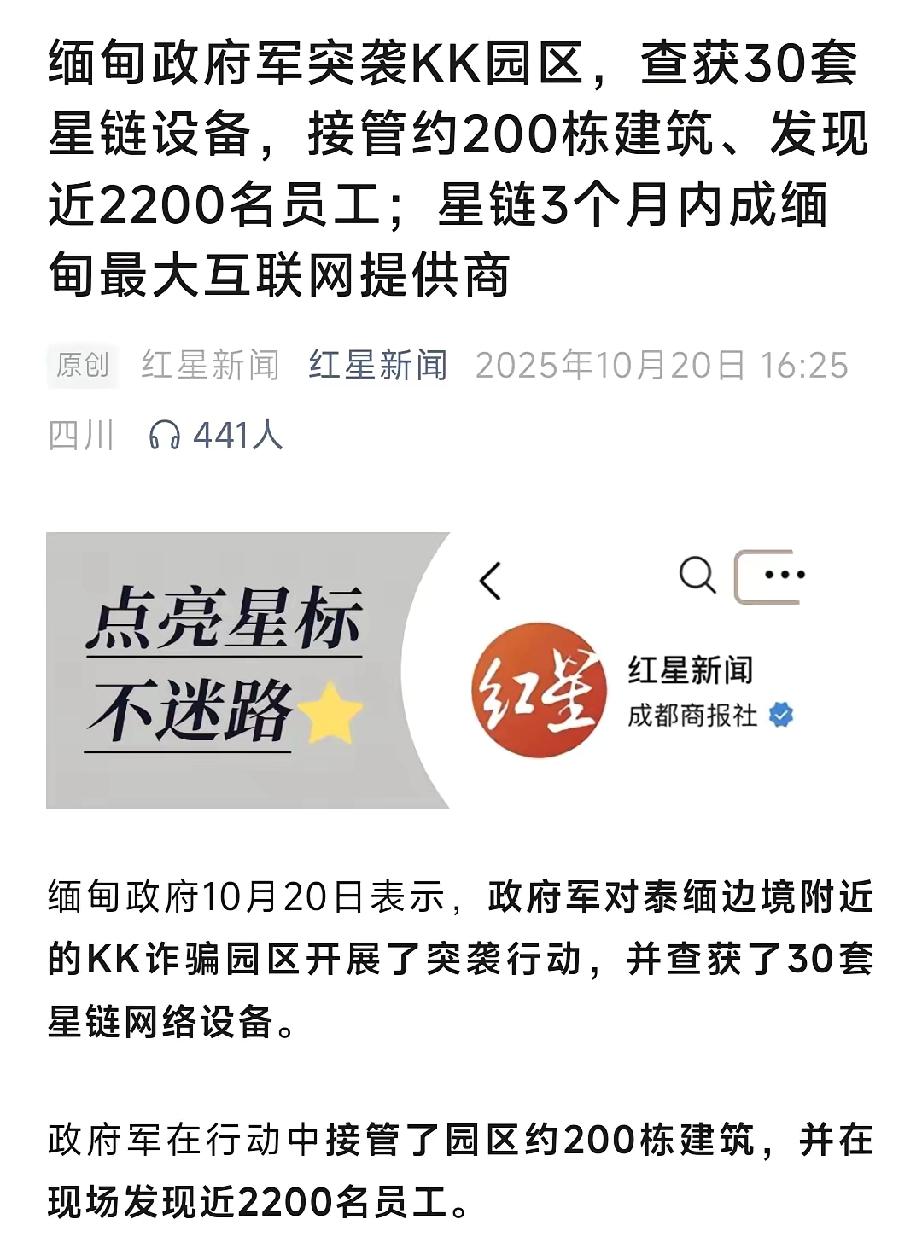 直接缅甸政府军偷袭了kk园区,接管了200多栋楼,抓获了电诈分子2200多人,也发现了马斯克的星链接收设备,看来资本啊还真的只是为金钱服务,不管对方是用来做什么的,只要给钱! 马斯克这么大的一个有钱的企业家,他的星链提供服务之前应该知道卖家是谁吧?
