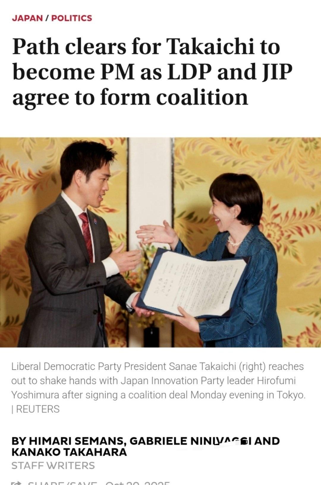 因为跟维新会签好了协议,两家联合了。就算第一轮选不上,第二轮凭借多数选票也能选上。² 这次是里程碑,自民党一家独大的时代结束,不得不跟小党组成处处掣肘的联合政府。看看她干得怎么样。
