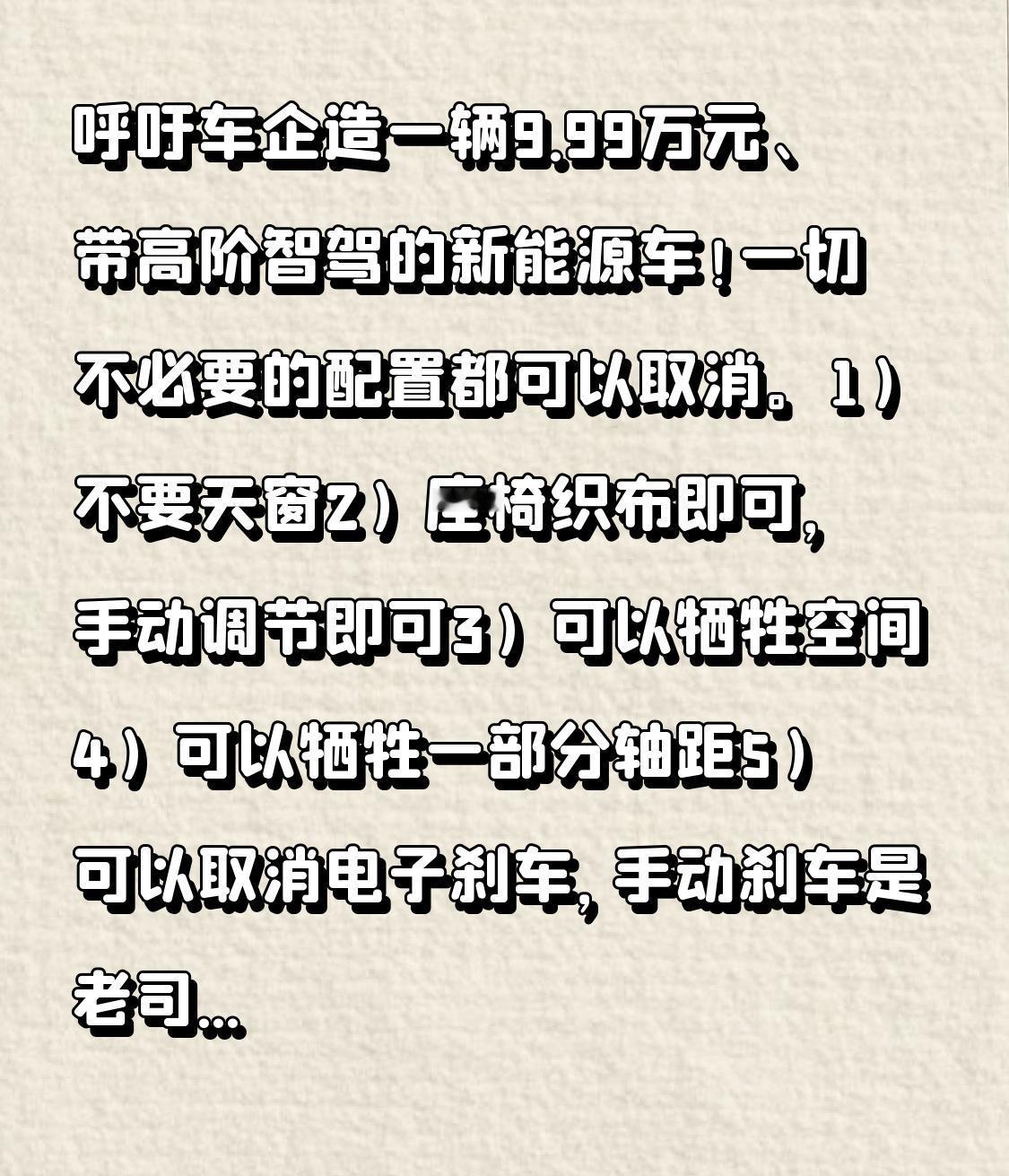 呼吁车企打造一款售价9.99万元、搭载高阶智驾的新能源车! 要求配备激光雷达,具备城市领航、代客泊车等功能。 其余不必要的配置均可取消。 不要天窗 座椅用织布材质,手动调节就行 可以牺牲空间 可以缩短一部分轴距 可以取消电子刹车,手动刹车是老司机的心头好 不要双层隔音玻璃 可以取消前后中央扶手箱 不用大屏,小屏幕足矣 取消所有影音娱乐设备、冰箱、彩电和大沙发 对音响音质和喇叭数量无要求 单电机即可,对动力需求不大 续航不低于300公里便可 贯穿式前后大灯可以舍弃 胎压显示、哨兵模式可以没有 后备箱手动开启就行 无钥匙进入也能取消 无线充电、化妆镜都可去除 暂时就想到这些,总之,只要有高阶智驾,所有舒适配置都能不要。@比亚迪 @蔚来@京东