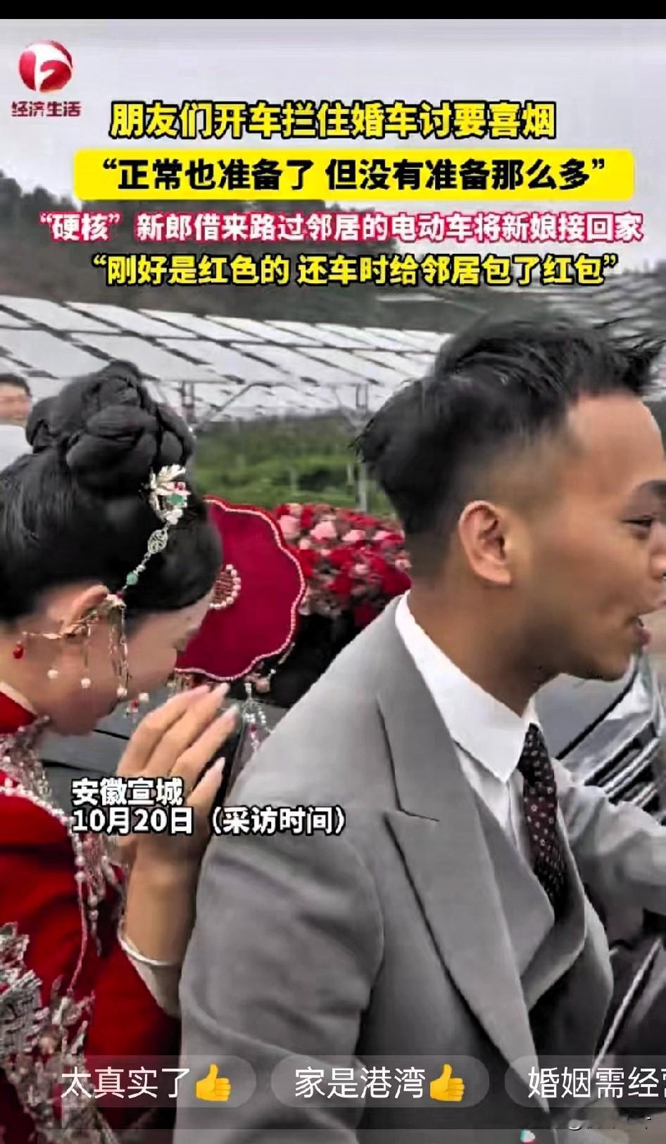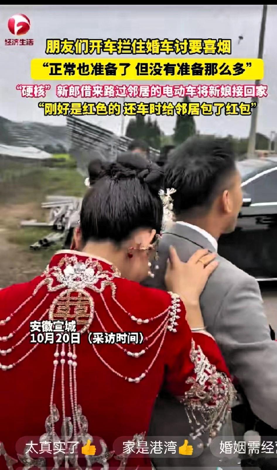 安徽宣城一男子结婚当天被朋友用车堵住婚车,非得要喜烟才肯放行。 新郎翻遍了婚车也没凑够烟,换旁人说不定早急得跟朋友红脸,或是手忙脚乱找人送烟,可他倒好,一眼瞥见邻居骑着辆红电动车路过,立马笑着跑过去借车。 邻居也是实在人,一听是新郎接新娘用,连问都没多问,直接把车钥匙塞过去,还笑着补了句“新婚快乐”,这随手的善意也太暖了!最让人感动的是新娘,没因为坐不上豪华婚车闹脾气,反而开开心心坐上电动车后座,紧紧抱着新郎的腰,一路上笑得眉眼弯弯,镜头里的画面甜得能溢出蜜。 现在好多婚礼总被“排面”绑架,比谁的婚车贵、谁的流程复杂,可这对新人用一辆电动车证明:婚礼的浪漫从不是靠排场撑起来的。那些堵婚车的朋友本想凑个热闹,没成想反倒帮他们留下了比任何豪华仪式都难忘的回忆——毕竟婚姻里最珍贵的,不就是遇事时两个人能一起笑着解决的默契嘛! 你们身边有没有过这种不搞虚头、反而特别戳人的婚礼小事?
