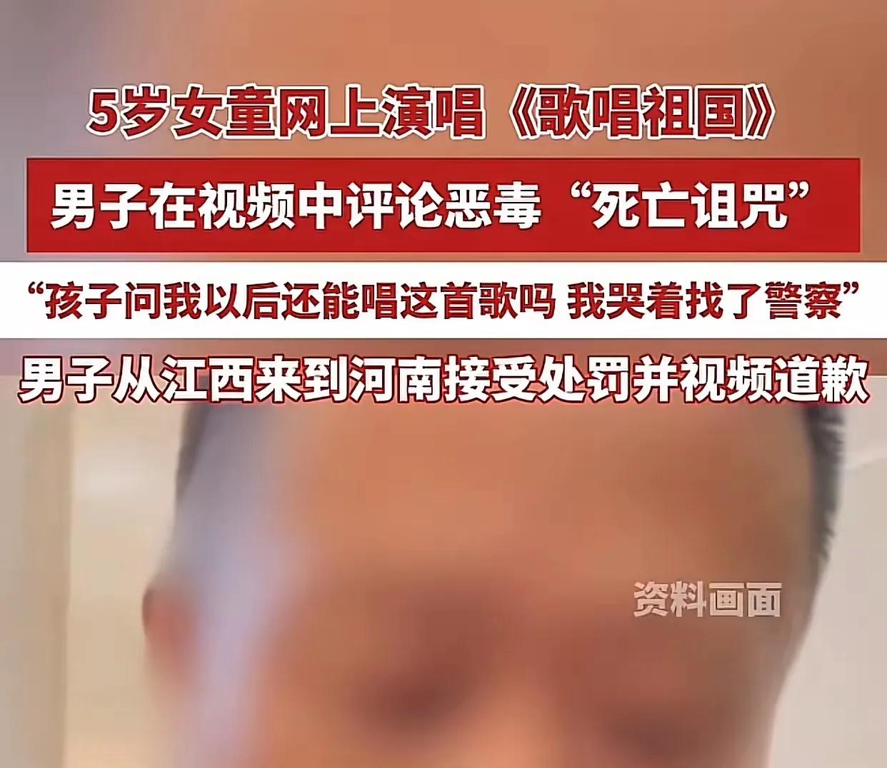 五岁女童满怀赤诚演唱《歌唱祖国》,却遭一男子在视频下发布“死亡诅咒”类恶毒评论。 孩子天真询问“以后还能唱这首歌吗”,母亲含泪报警。最终该男子从江西前往河南接受处罚并录视频道歉。 这恐怕不是一句道歉就能了事的吧?这种人和人渣有什么区别?孩子的爱国情感遭遇诋毁,童心遭遇践踏,一句道歉就完了?少说那些废话,先赔偿孩子的精神损失,再自首改造,把你那颗黑了的心好好洗干净,再出来重新做人。