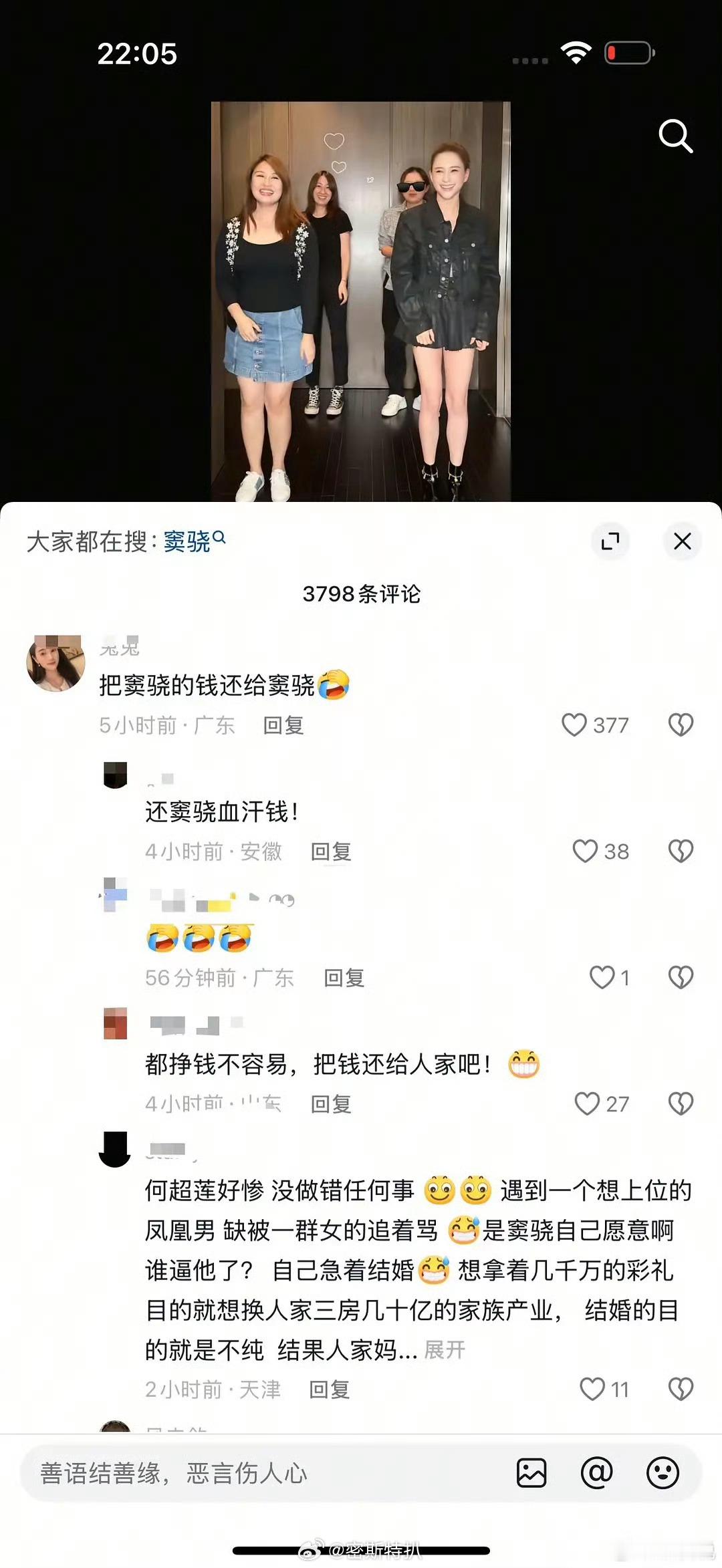 何超莲的抖评论区被冲了,性别一换 嘲的也是女方 一口一个捞女失败…别太i男了…有些女生还上赶着附和…🤮🤮🤮