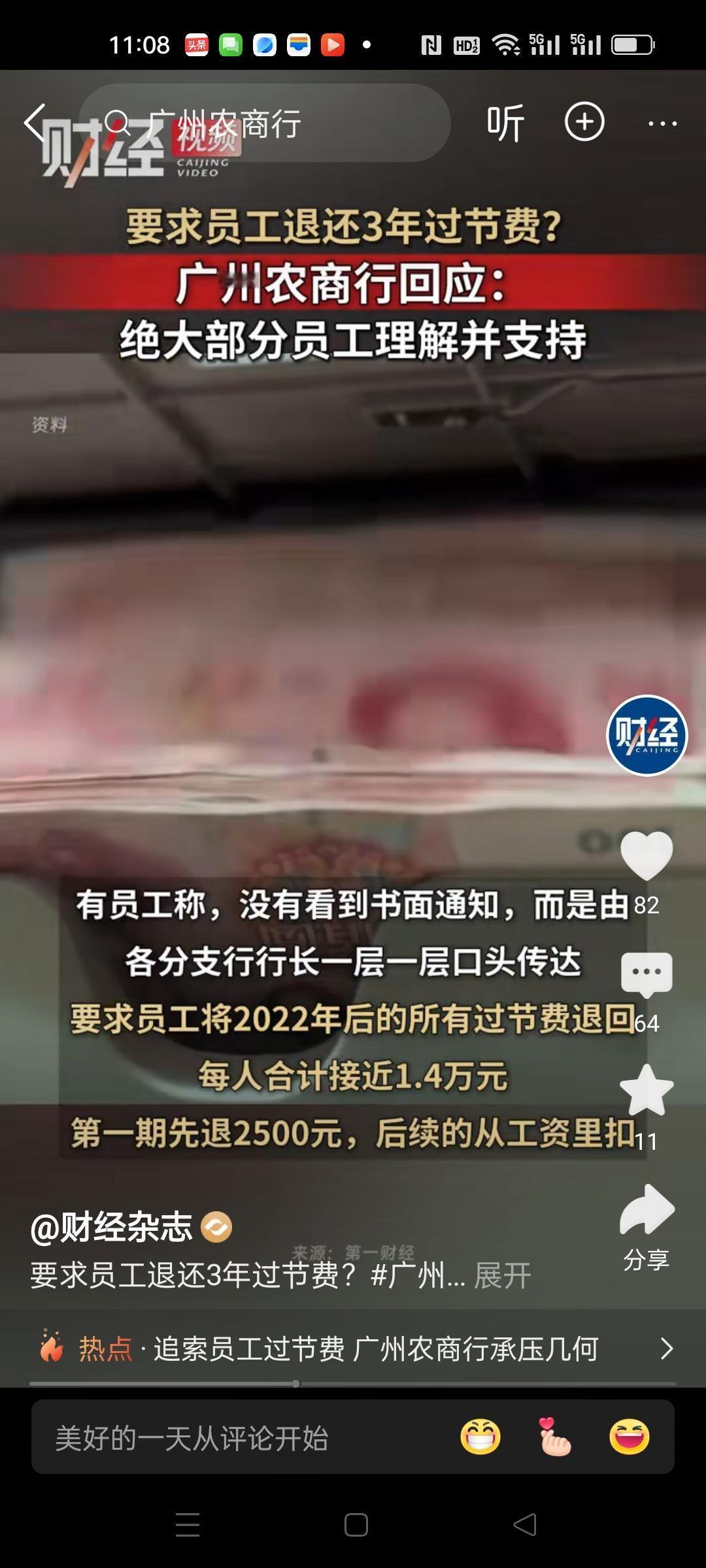 广州农商行银行要求员工退还近3年过节费。 每人1.4万元左右,第一期退还2500