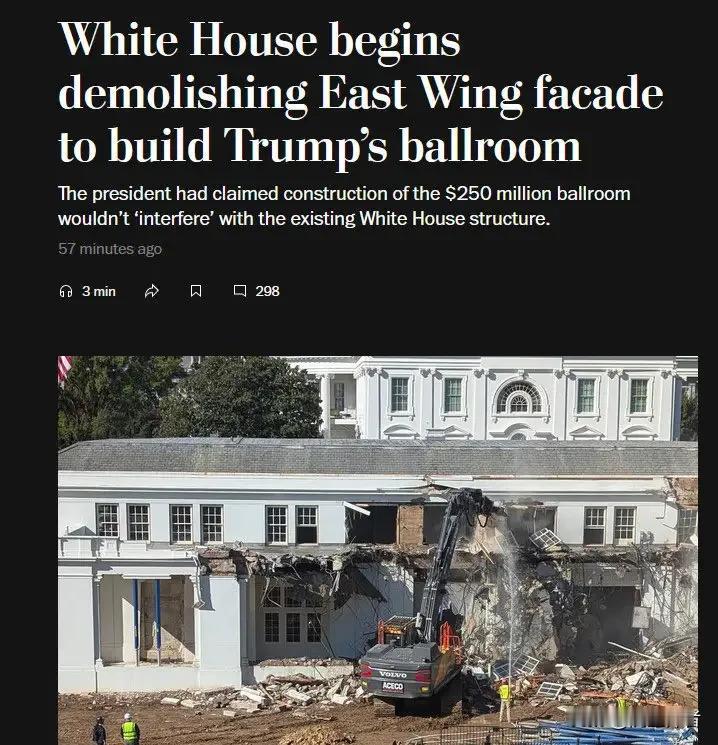 特朗普改写白宫历史,成120年来改扩建白宫第一人。1902年西奥多·罗斯福总统当总统对白宫进行了大规模内部改造,并正式命名为“白宫”。 美国白宫建筑老旧,空间狭小。120年来,美国的历届总统、政府和白宫工作人员都渴望在白宫内拥有一个能够容纳更多宾客的大型活动空间。特朗普吐槽白宫没有大的宴会厅,无法容纳大型活动,只能在南草坪搭建帐篷招待宾客,他认为这种方式不仅在安保上不妥,而且一下雨简直是灾难。 10月20日,特朗普负责主导的白宫宴会厅改扩建工程开工。只见施工队正在美国白宫东翼部分建筑的拆除工作,以便为特朗普耗资约2.5亿美元新建“顶级”宴会厅腾出空间。 据公开资料显示美国的这个国家宴会厅约8361平方米,可以容纳650~900人入座。据悉这个宴会厅将耗资2亿美元,不过不要担心,这钱可不是美国纳税人的钱,相关资金由特朗普和其他未公布身份的捐赠者承担。