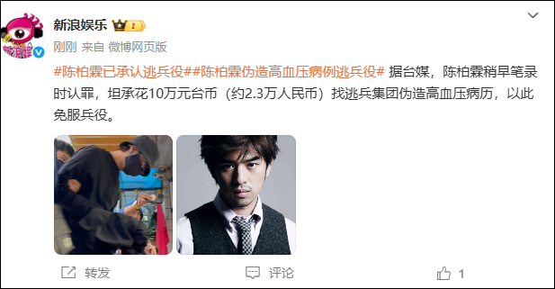据台媒,陈柏霖稍早笔录时认罪,坦承花10万元台币(约2.3万人民币)找逃兵集团伪造高血压病历,以此免服兵役。