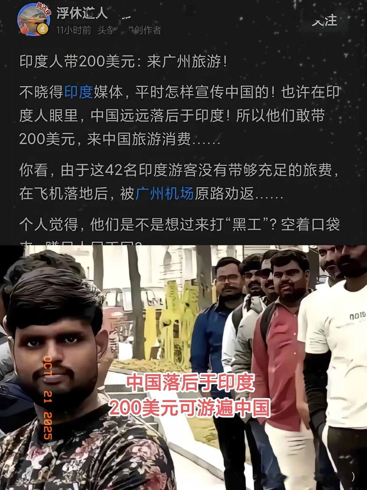 “中方远远落后于印度”?最近一群印度游客揣着不足200美元就来广州,刚下飞机就被遣返了,这原因真是让人哭笑不得。 身上就带这么点钱敢出国游,说真的,勇气可嘉。有人猜,他们可能打心底觉得中国比印度落后,以为200美元足够在中国晃悠了。这话听着有点扎心,但细想也不是没可能。 这些年关于印度的奇葩报道不少,可真遇到这种事,还是觉得挺无奈的。不是说钱少就不能旅游,但出国前好歹做点功课吧?连基本的消费常识都没有,折腾半天只能打道回府,既耽误自己又浪费资源。 说到底,国与国之间的认知偏差得靠更多了解来消除。真想来中国看看,不妨先好好了解下这里的实际情况,别被过时的印象带偏了。不然,白跑一趟多不值当。各位读者你们怎么看?欢迎在评论区讨论。