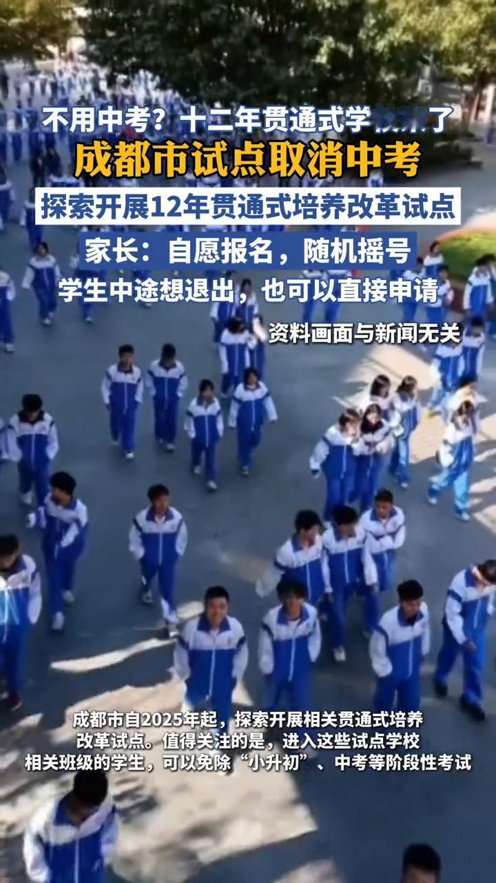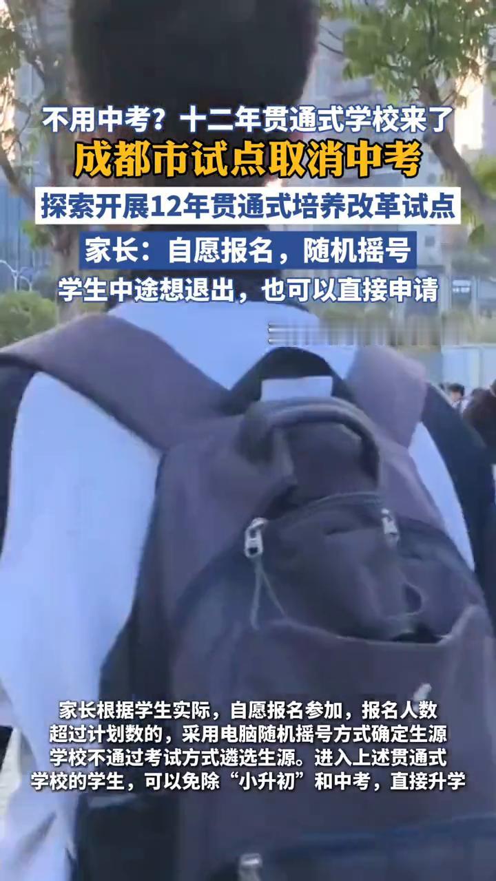 不用中考?十二年贯通式学校来了!成都市试点取消中考。 探索开展12年贯通式培养改革试点。家长:自愿报名,随机摇号。学生中途想退出,也可以直接申请。 最近,四川成都迎来多所"小初高"十二年贯通式学校和"初高"六年贯通式学校。当地教育局官网相关政策解读显示,成都市自2025年起,探索开展相关贯通式培养相关班级的学生,可以免除"小升初"、中考等阶段性考试。 成都首批参与试点的学校中,既有公办学校,也有民办学校。其中公办学校有成都七中八一学校、青羊区教科院附属实验学校、盐道街中学外语学校、成都列五中学、四川天府新区香山中学。 值得关注的是,试点生源从小学一年级(或初一)的政策性入学学生中产生,十二年一贯制起点为小学一年级,六年一贯制起点为初一。而如果这些学生中途想退出,也可以直接申请。 有成都家长表示,她孩子所在学校正是此次六年一贯制试点的公办学校之一,但目前并非全校整体试点,而是只有两个班,并且每一个班的人数有限制。她表示:"可能没有外界想象的那么大规模。"这一贯通制,对我和周围家长而言,最大亮点就是"免中考",不用担心孩子未来被分流到职高。所以很多学生都报名了,数量远远超过要招的人数,最后摇号定的。