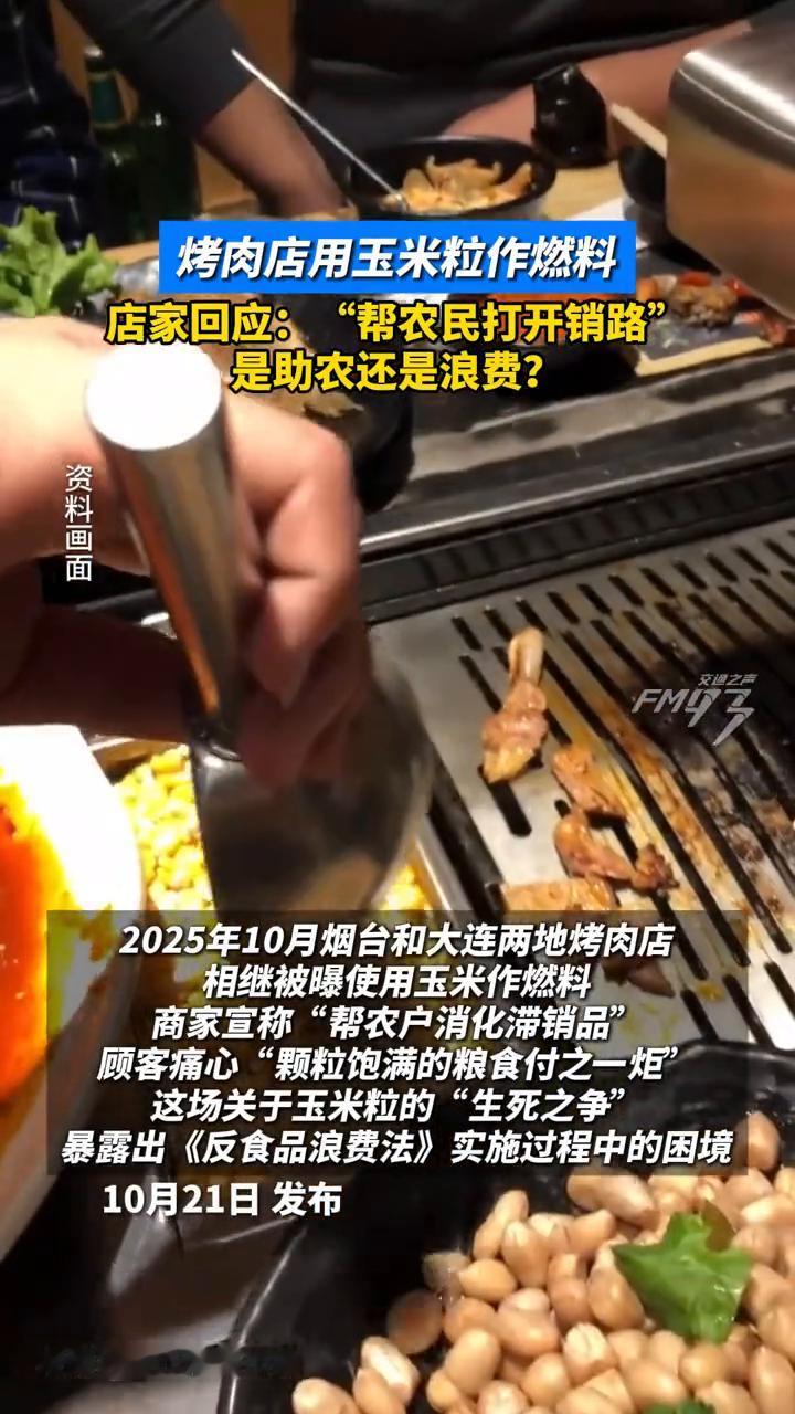 烤肉店用玉米粒作燃料,店家回应:"帮农民打开销路",是助农还是浪费? 江南都市报。 2025年10月,烟台和大连两地烤肉店相继被曝使用玉米作燃料,商家宣称"帮农户消化滞销品",顾客痛心"颗粒饱满的粮食付之一炬"。这场关于玉米粒的"生死之争"暴露出《反食品浪费法》实施过程中的困境。 10月21日发布,店家回应:"帮农民打开销路"。烟台某烤肉店在社交平台展示玉米燃料后,店长还强调这些玉米部分购自周边农户,"是帮农民打开销路"。大连市民隋先生就餐时也遇相同情况,农业部门迅速表态"不提倡该行为"。