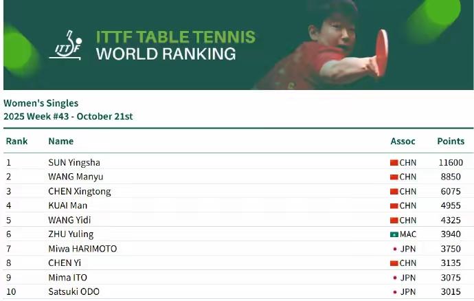 10月21日国际乒联公布2025年第43周排名,孙颖莎太牛啦,11600分连续1