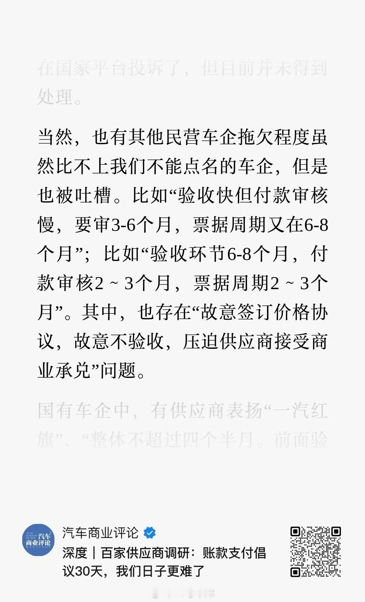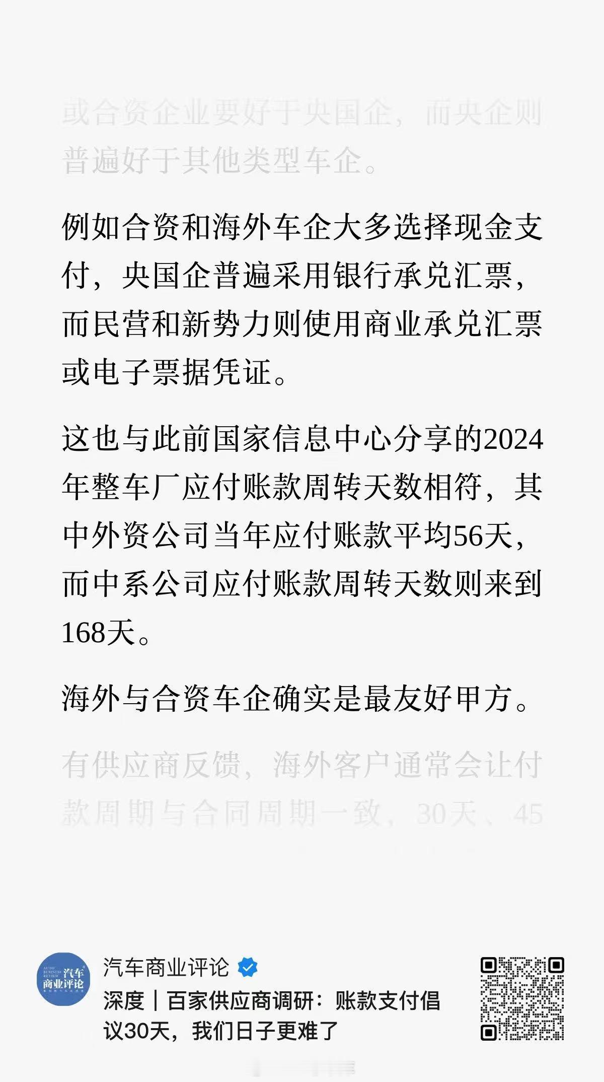 这篇主机厂对供应链账期的调查,说合资和海外车企、央国企、民营新势力汇款方式不同,「外资公司当年应付账款平均56天,而中系公司应付账款周转天数则来到168天。」看得出来海外与合资车企还是最友好的甲方啊。