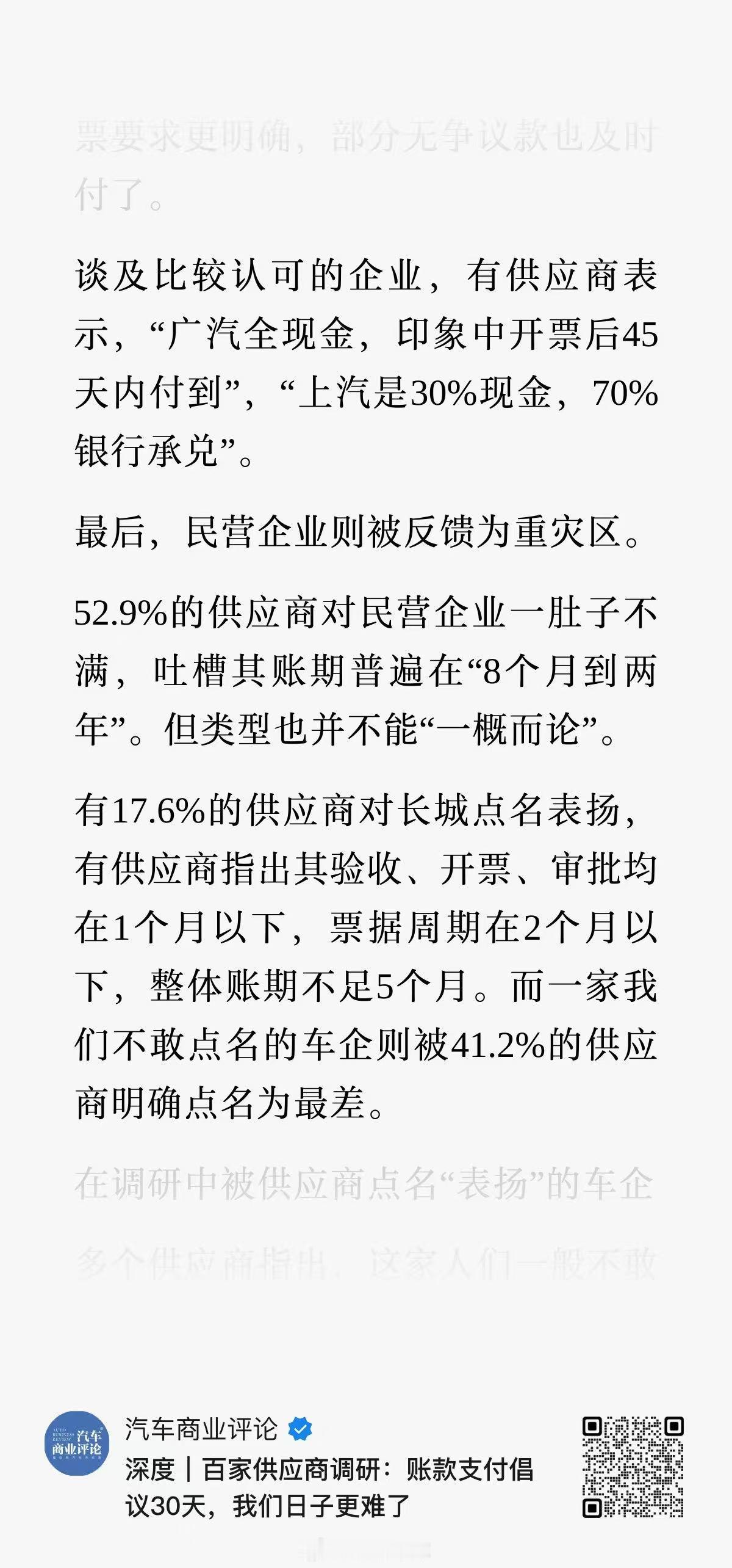 而具体到车企表现,广汽、上汽、长城被点名表扬,「而一家我们不敢点名的车企则被41.2% 的供应商明确点名为最差……企业账期在2年左右,验收周期、付款审批、资金到账均很慢…验收周期在 8-12 个月、开票周期 3-6 个月、付款审批周期 8-12 个月,而电子债务凭证兑现到现金又要一年以上,累计付款周期已经到 1.5 年~2.5 年。」